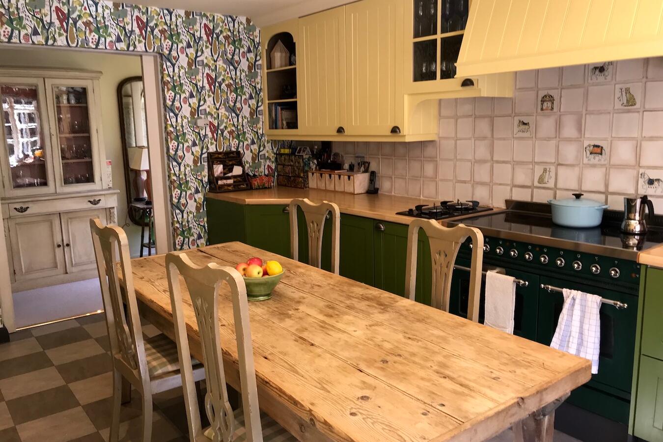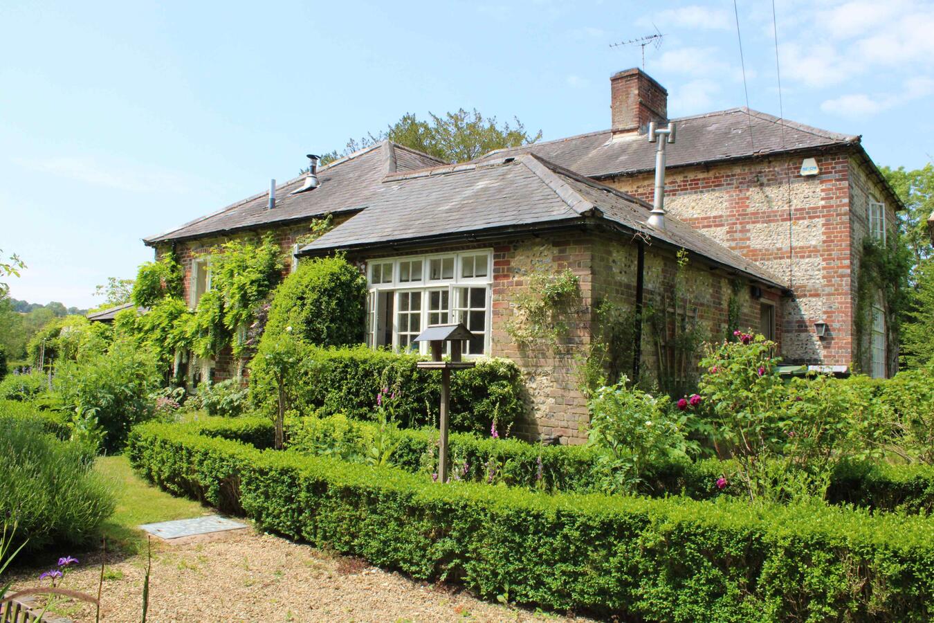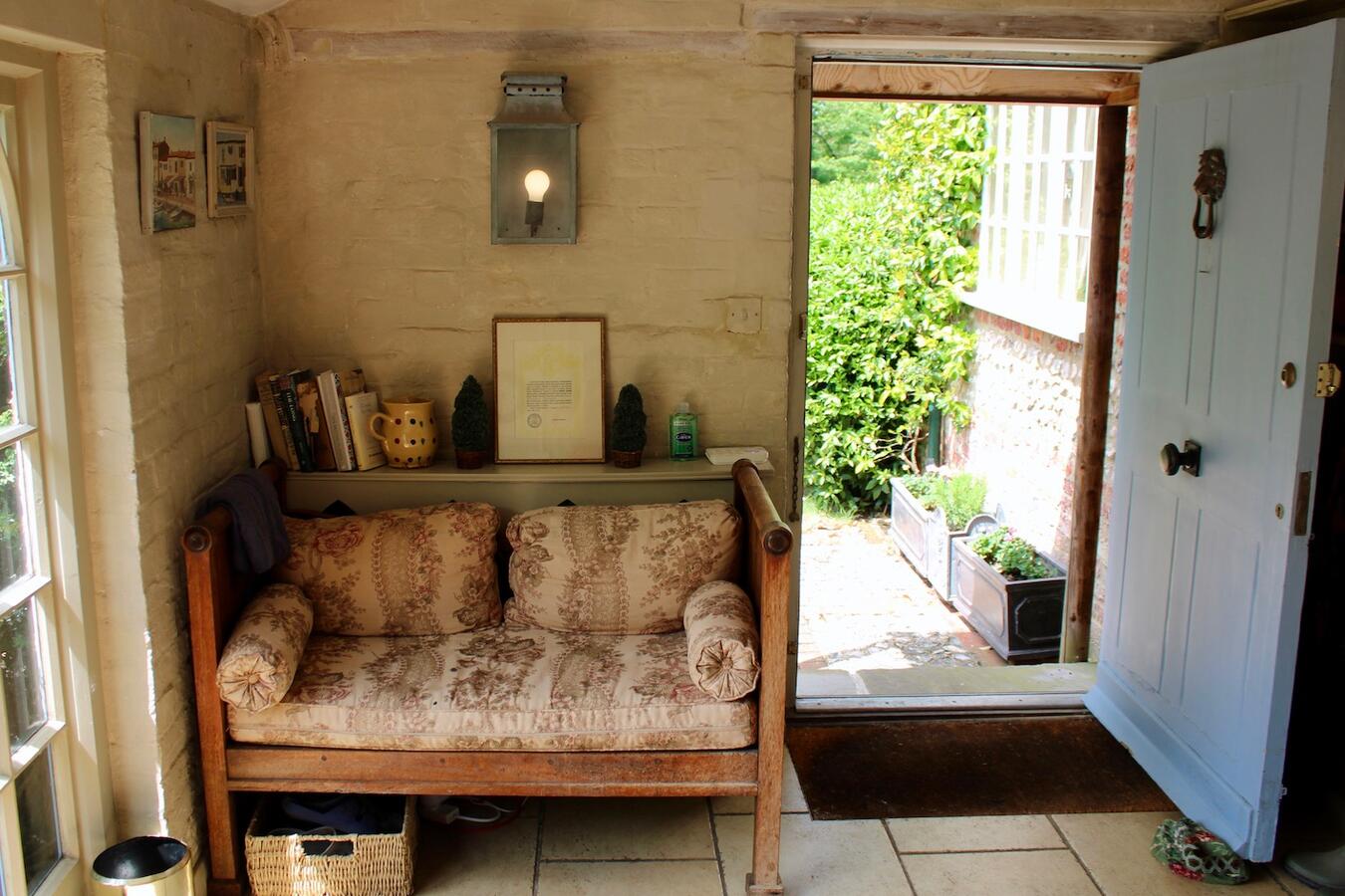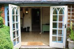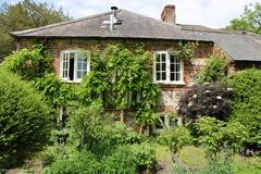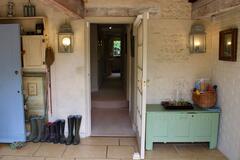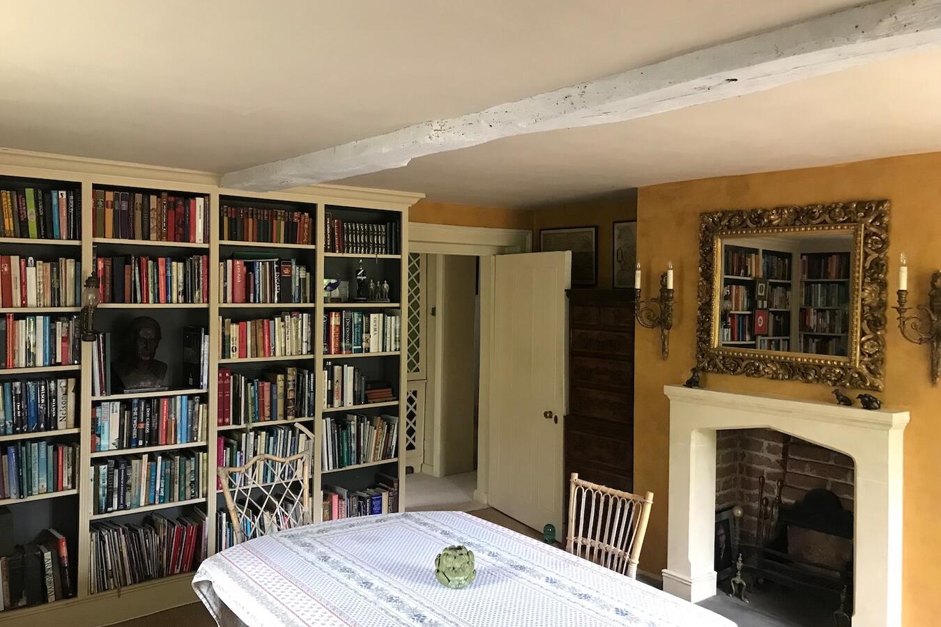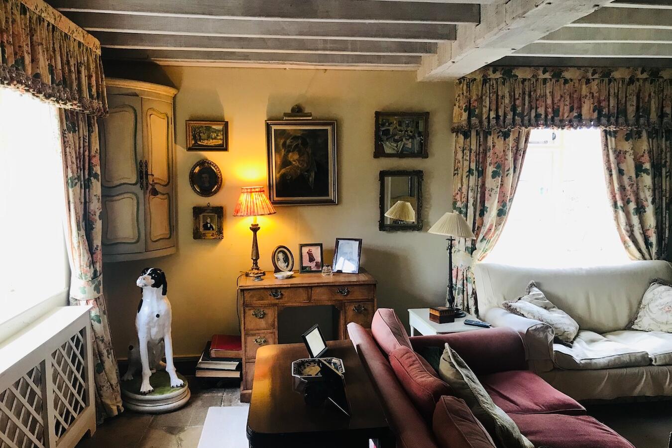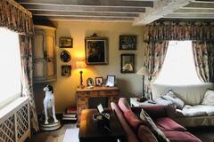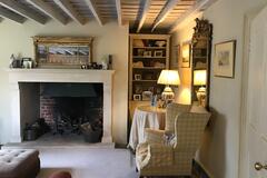 The 3 bedroom house provides a kitchen, dining room, sitting room, library, porch, and two bathrooms. Interiors feature exposed beams, traditional fireplaces, a country kitchen and lived-in décor suitable for heritage shoots, interviews and editorial content.