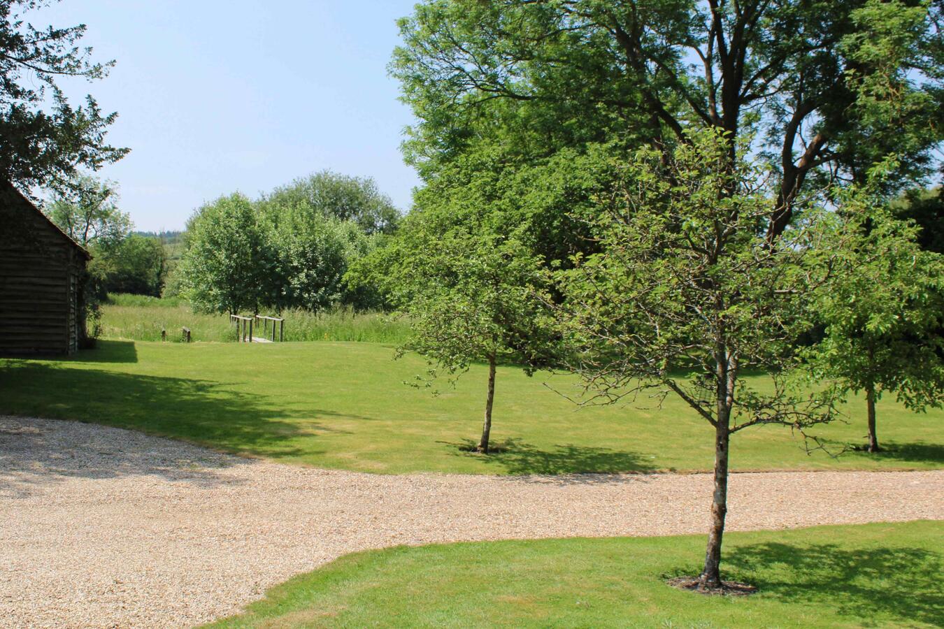 The surrounding grounds provide a wide choice of natural settings, including a wild meadow, a woodland edge, a formal garden, paddock, fields, and a cabin positioned directly over the chalk stream. A painted gypsy caravan offers an additional characterful backdrop. The long driveway, open field and paddock offer generous space for parking, trucks, crew and catering setups.