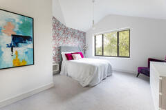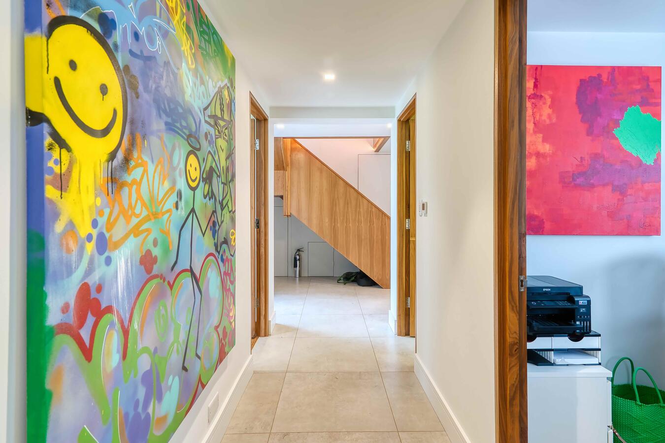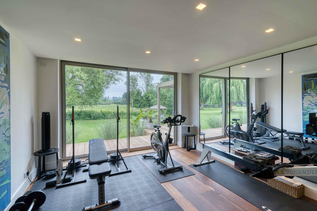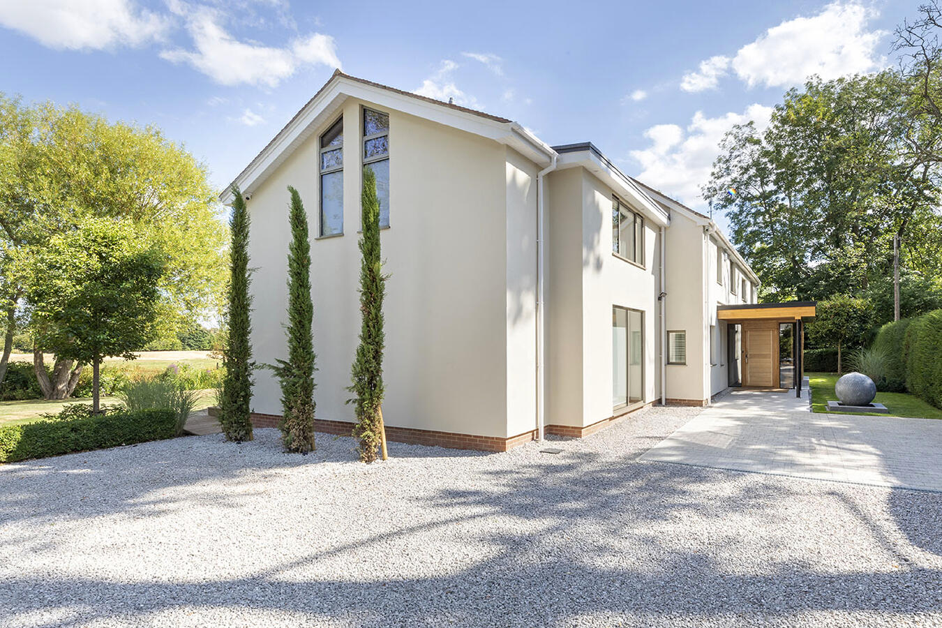 Upstairs, five double bedrooms and four bathrooms provide scale and comfort, including a standout double-height principal suite with open dressing area and garden views. Outside, around an acre of manicured lawn wraps around the house, with a stream, mature trees and over 80sqm of Millboard decking - ideal for lifestyle, family, garden or summer campaign shoots.
