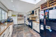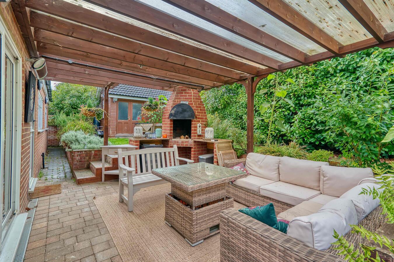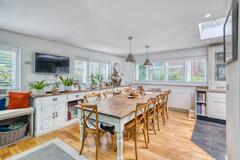 The heart of the home is a wide, open plan kitchen / dining / living area featuring a freestanding wood burning stove - perfect for productions seeking a natural, lived-in family backdrop. There's also a separate living room that opens directly onto a covered patio and outdoor kitchen area, providing a ready made exterior set up without the need for additional cover.