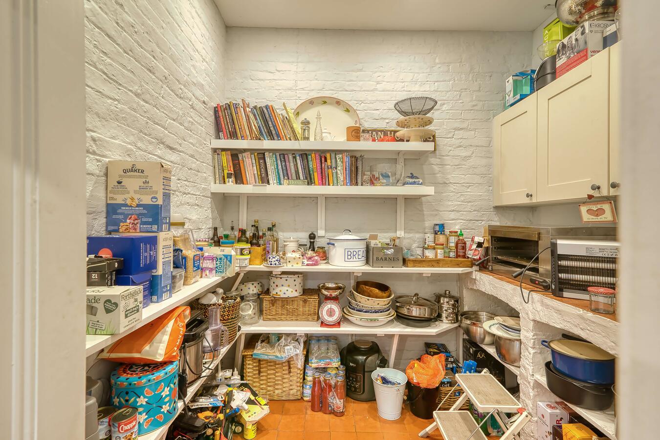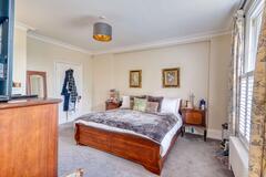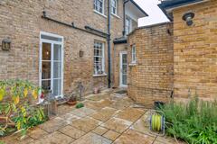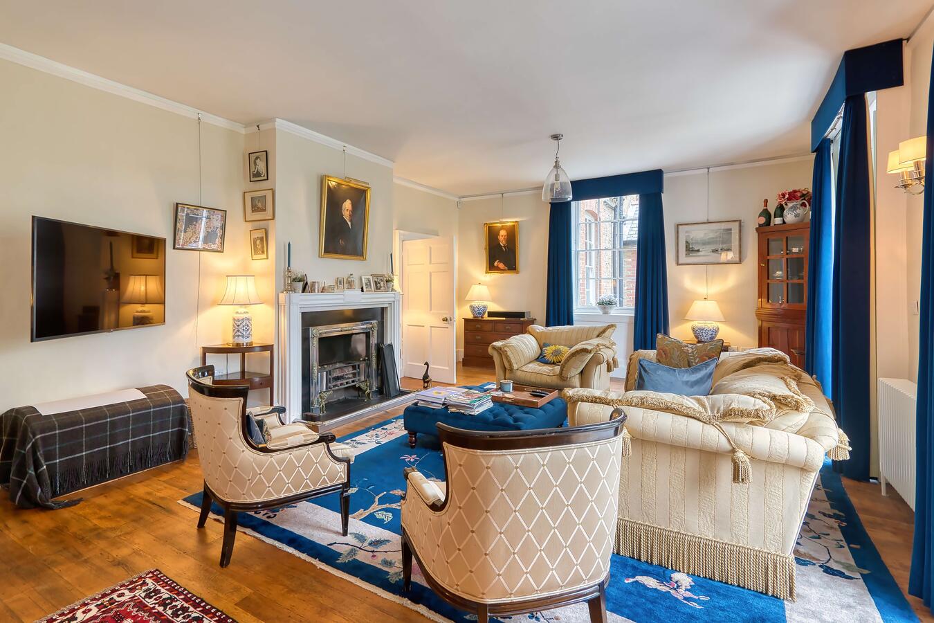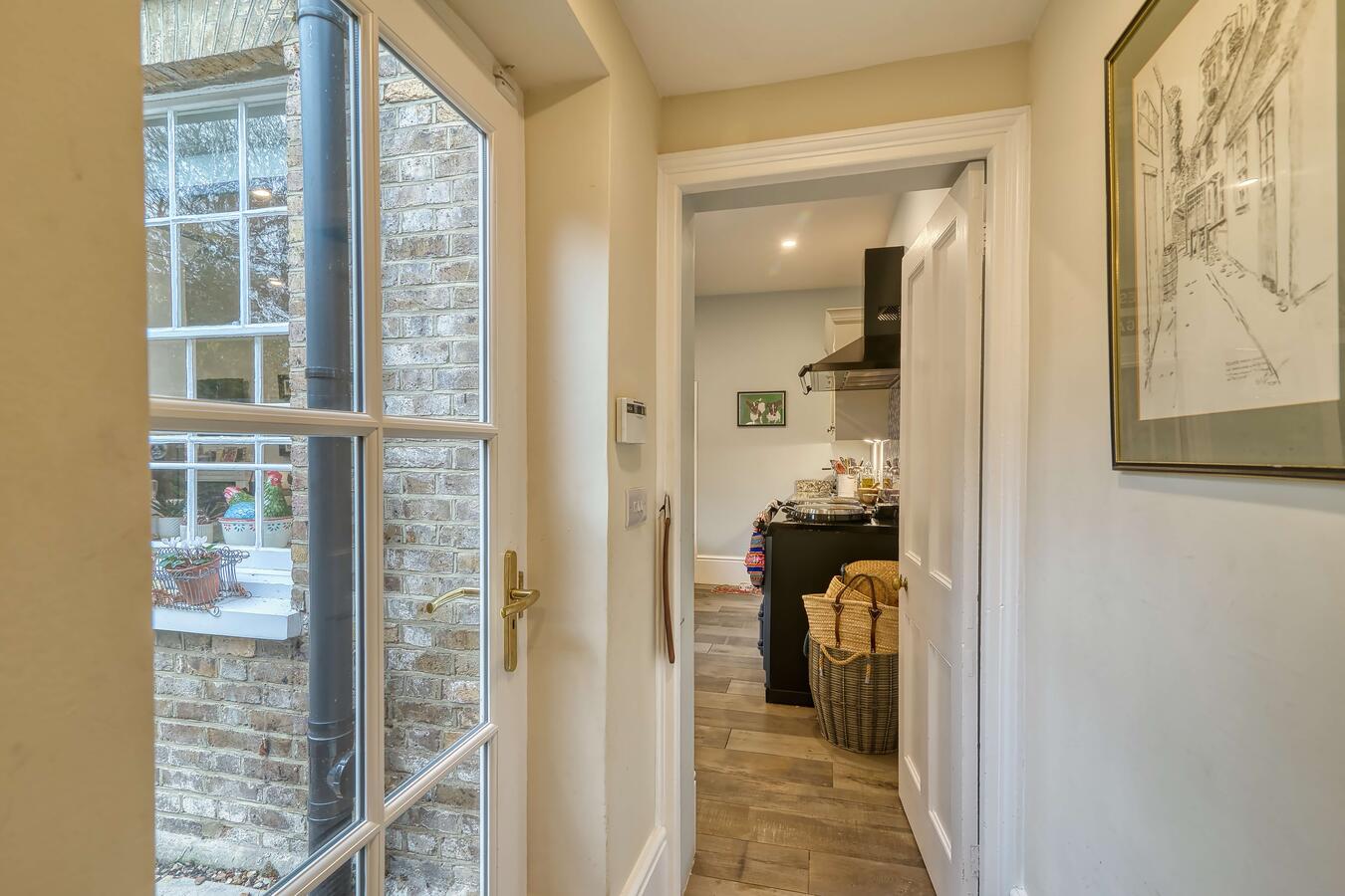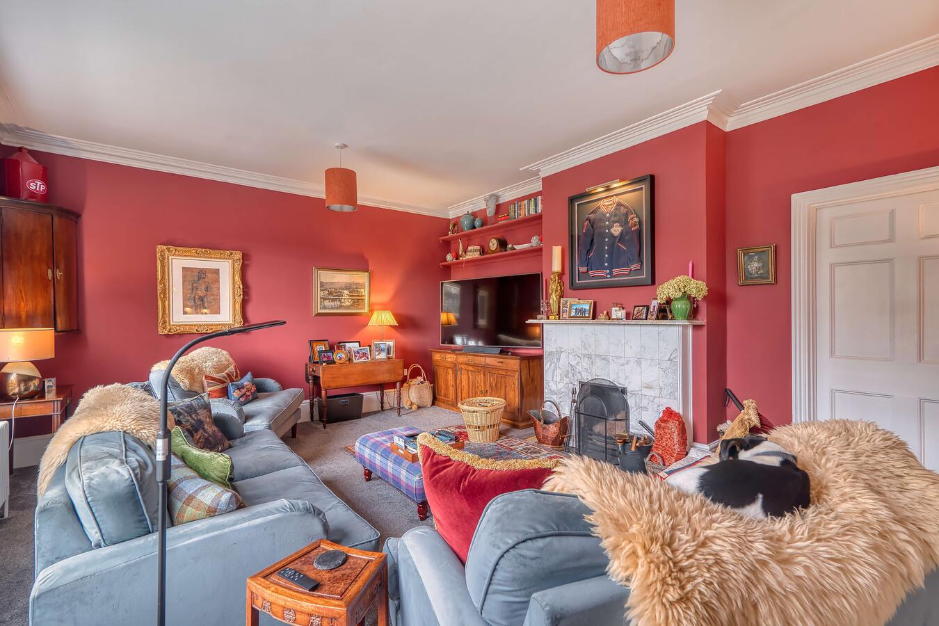 Rich in Georgian features, the house includes fireplaces, cornicing, large sash windows and doors, arches and detailed architraves. The elegant country-style kitchen with walk-in pantry is open plan to the dining room, with interconnecting double doors leading to a richly coloured living room that can be closed off if required. These spaces overlook the private patio garden and large gated car park, suitable for multiple vehicles.