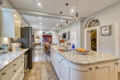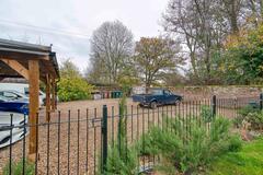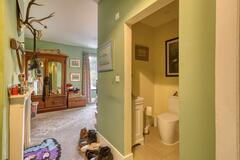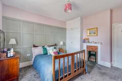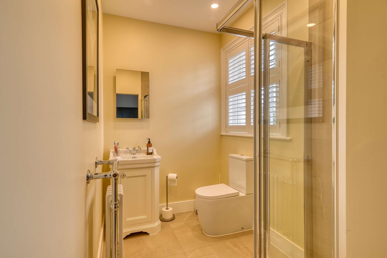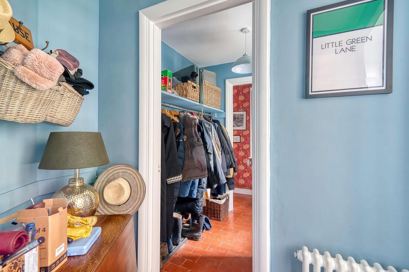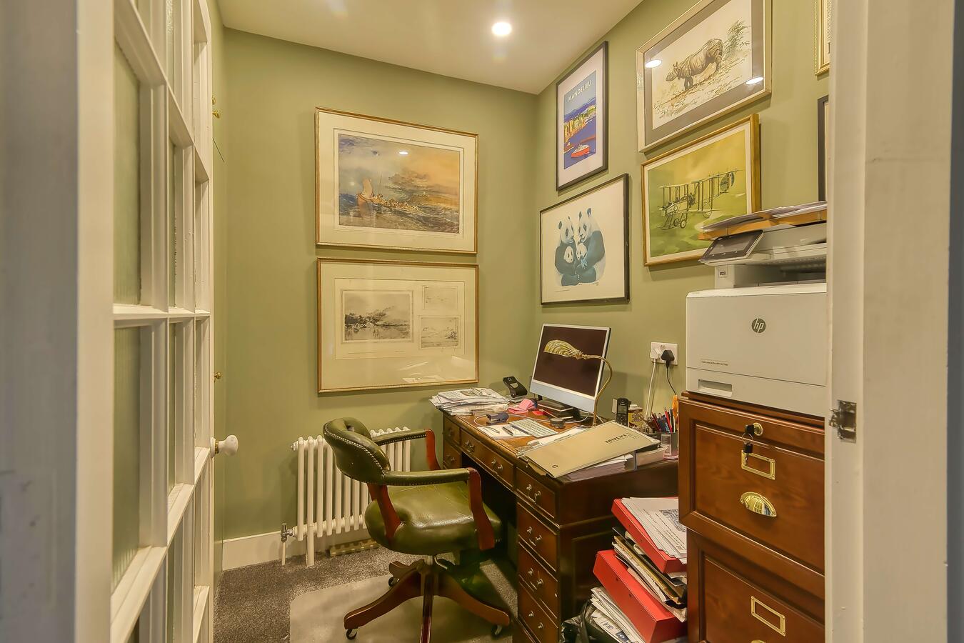 Rich in Georgian features, the house includes fireplaces, cornicing, large sash windows and doors, arches and detailed architraves. The elegant country-style kitchen with walk-in pantry is open plan to the dining room, with interconnecting double doors leading to a richly coloured living room that can be closed off if required. These spaces overlook the private patio garden and large gated car park, suitable for multiple vehicles.