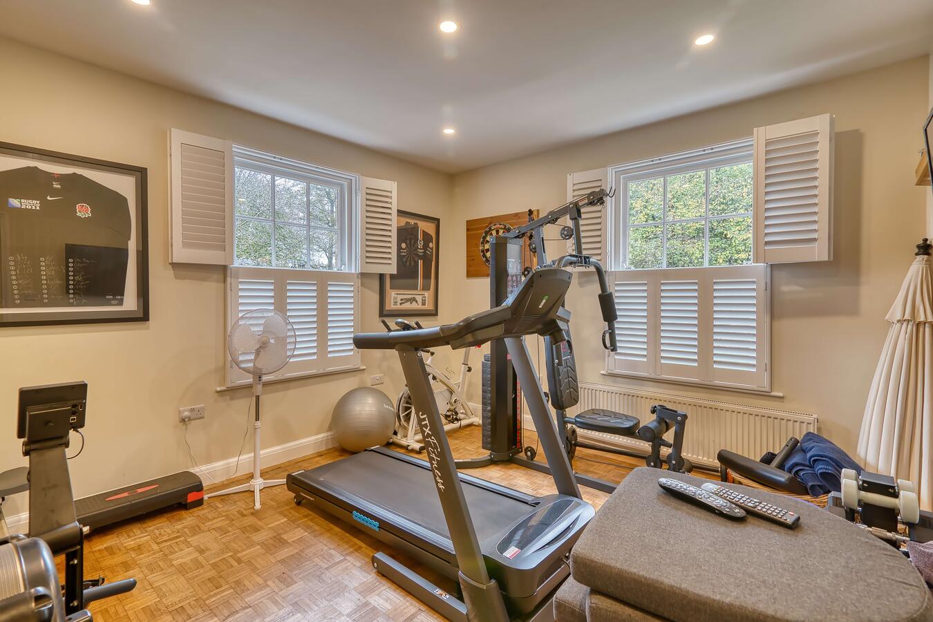 The ground floor also features a grand drawing room with triple-aspect French doors opening onto the rear garden, a generous entrance hall with fireplace, cloakroom and WC. Additional spaces include a utility room and a home gym with sauna.