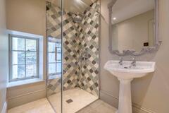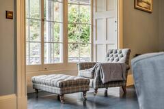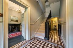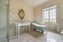 The main house features seven bedrooms, grand reception rooms and a striking entrance hall with mosaic-style flooring, reading room and original staircase. Large windows flood the interiors with natural light and frame panoramic views of the surrounding hills.