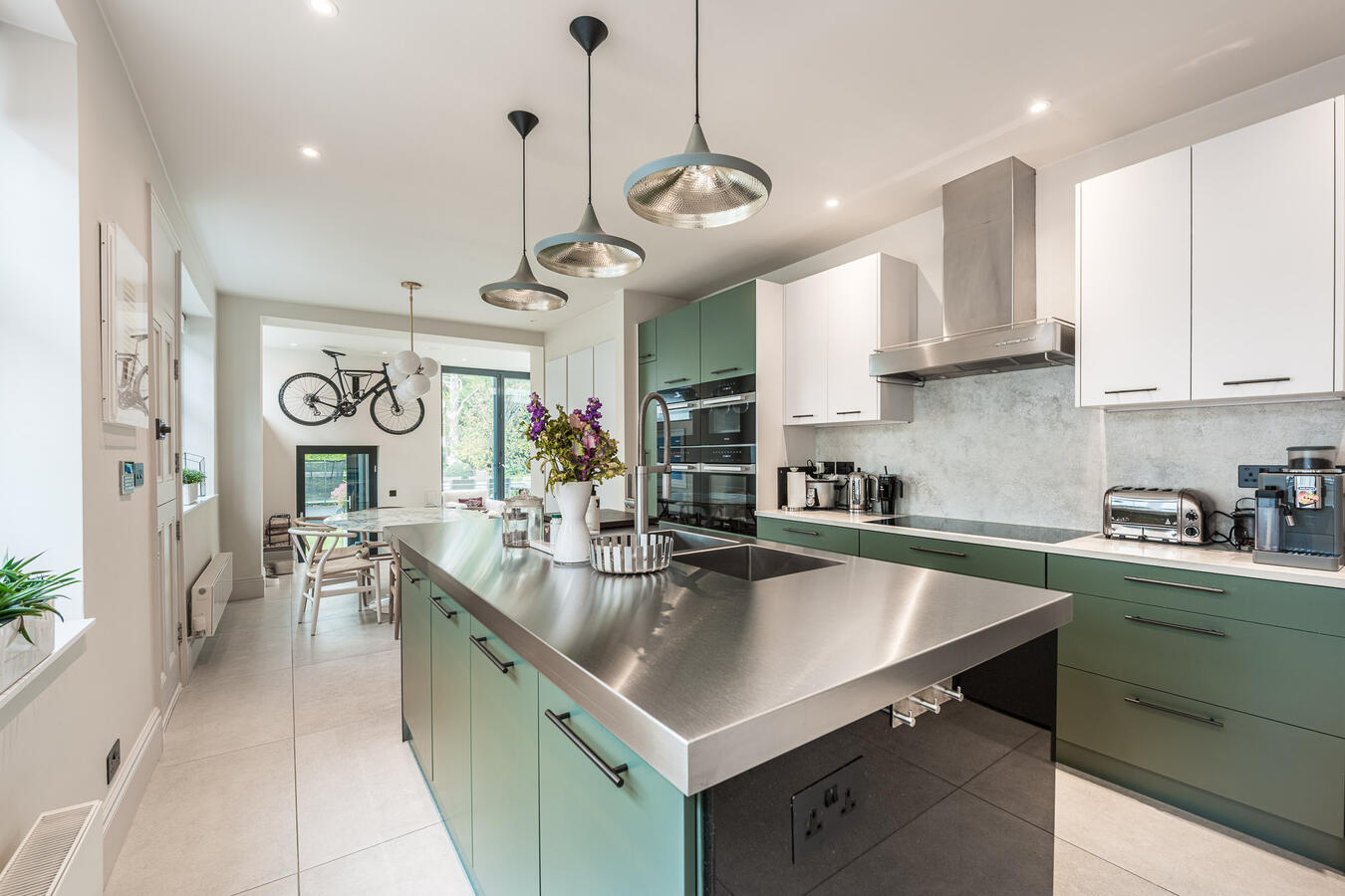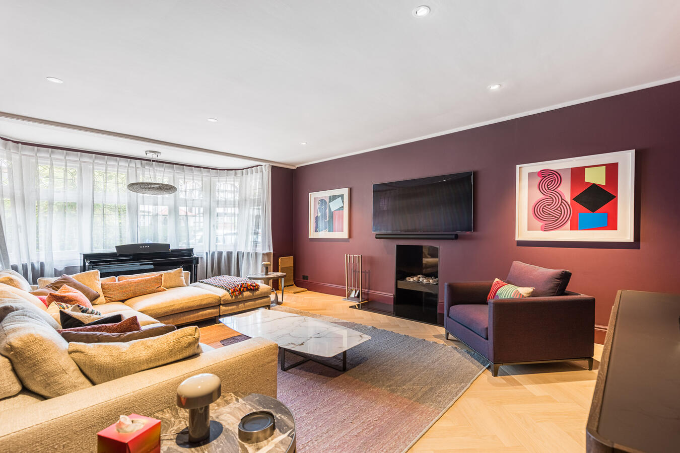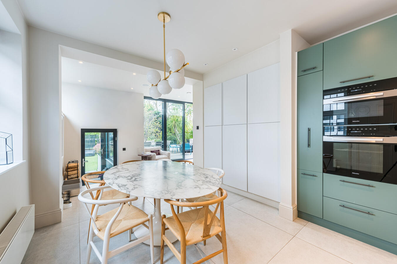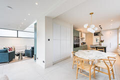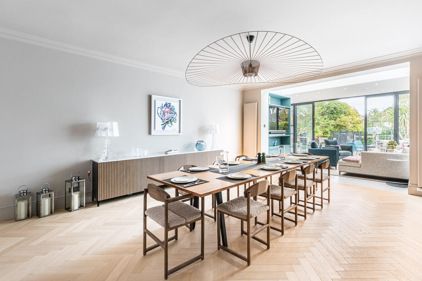This stylish 3,500 sq ft home spans multiple levels and features a bespoke kitchen with statement lighting, a bold front reception room in deep tones and a contemporary family TV room opening onto a beautifully landscaped garden. Throughout, a mix of materials - from polished metals to natural timber and stone - add visual texture and warmth.