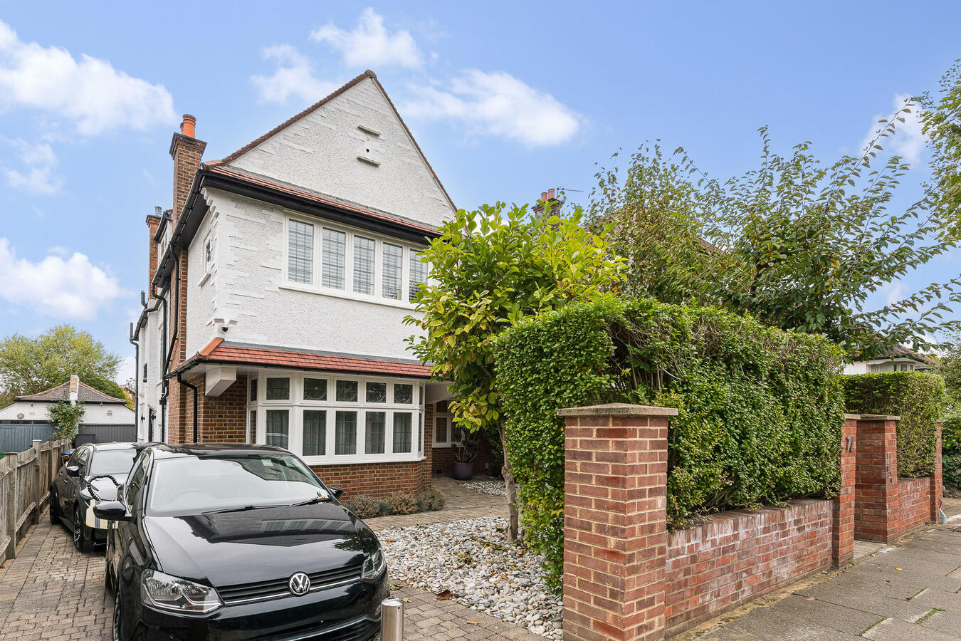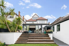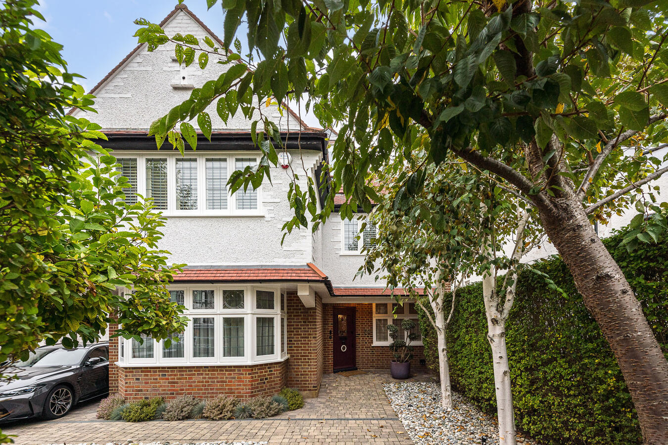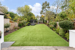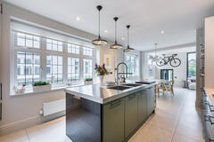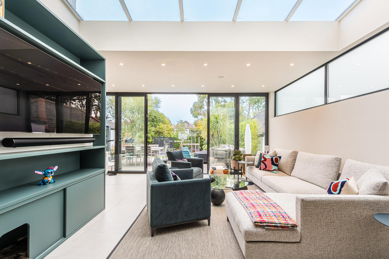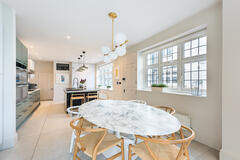 This stylish 3,500 sq ft home spans multiple levels and features a bespoke kitchen with statement lighting, a bold front reception room in deep tones and a contemporary family TV room opening onto a beautifully landscaped garden. Throughout, a mix of materials - from polished metals to natural timber and stone - add visual texture and warmth.