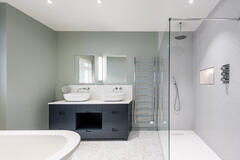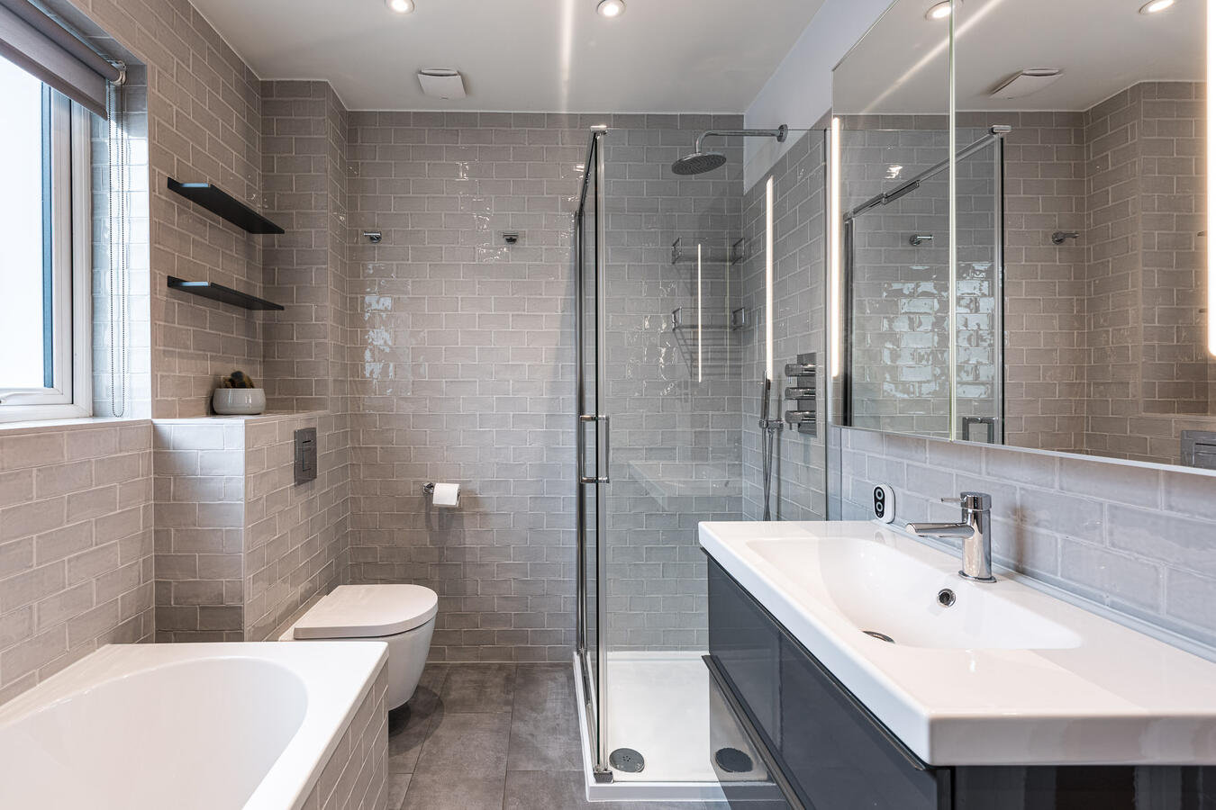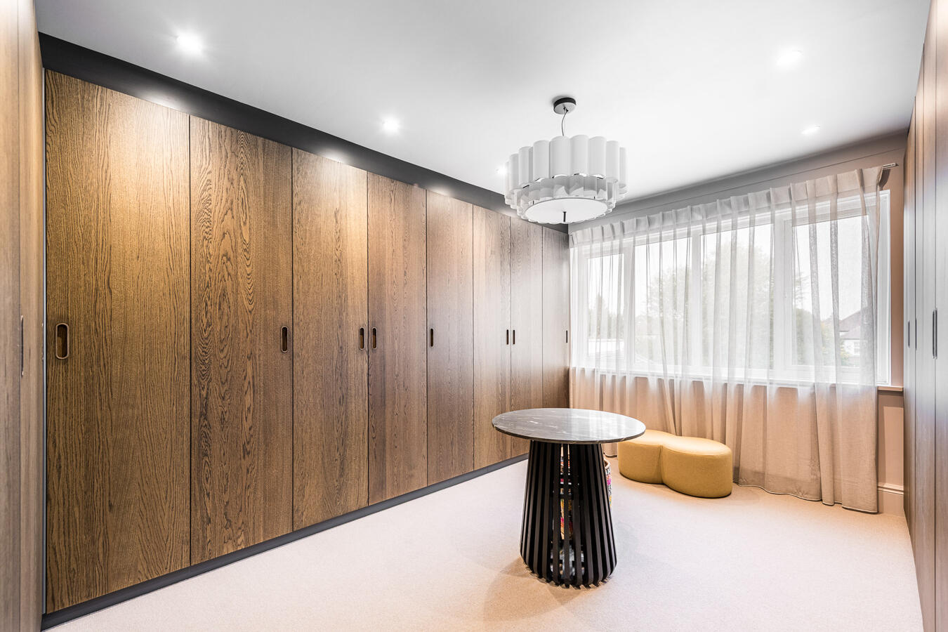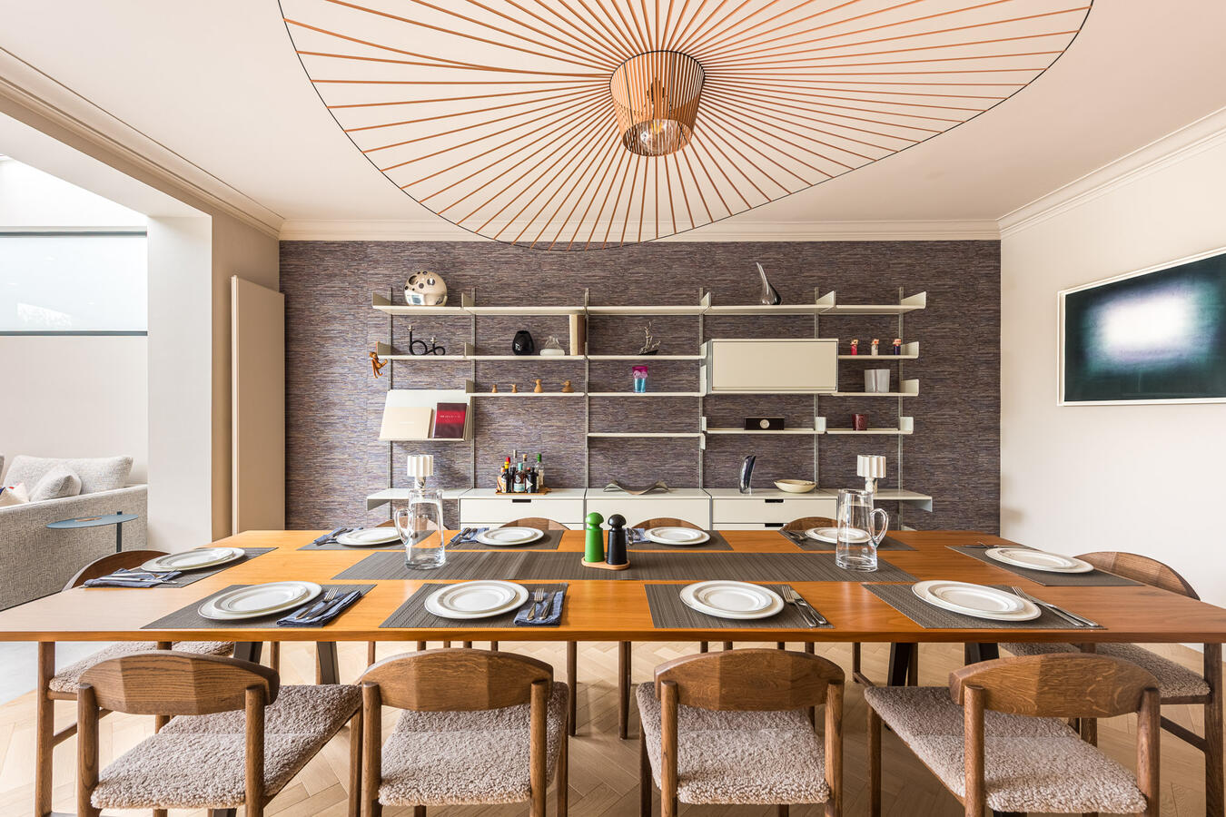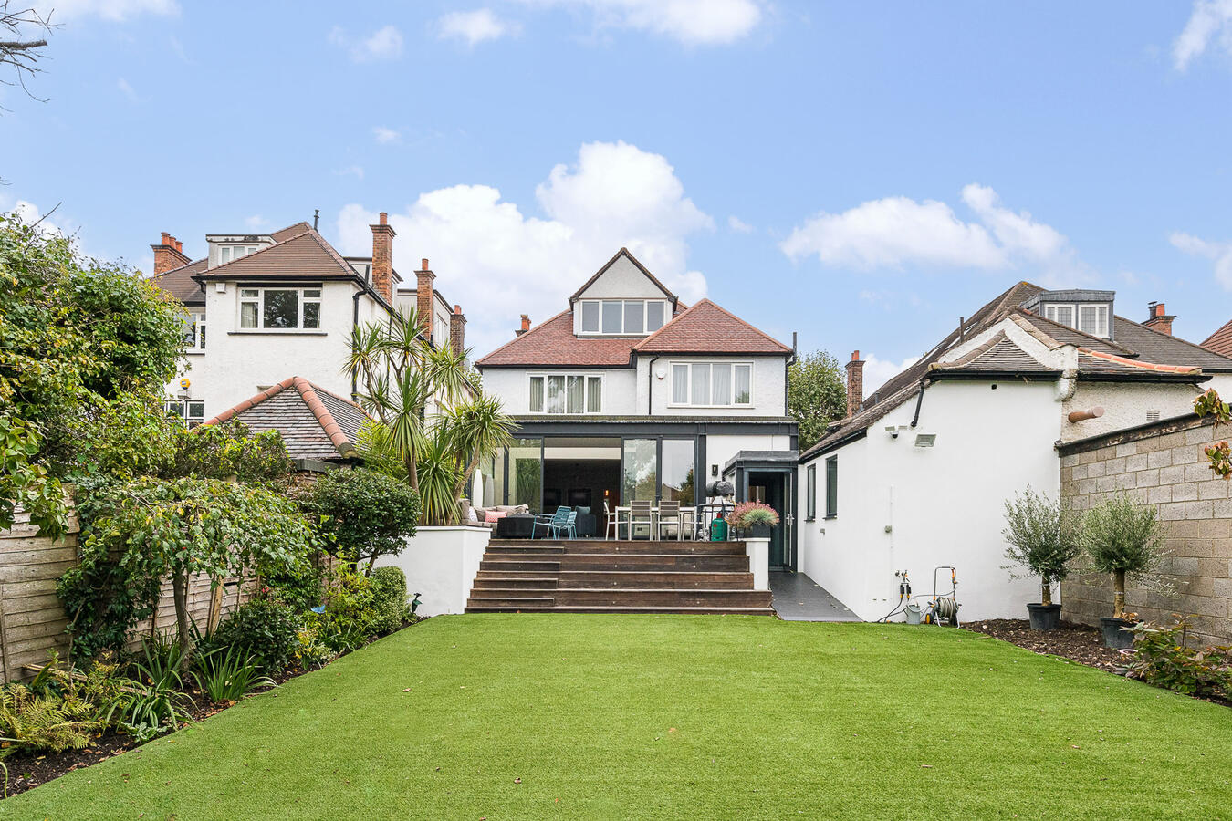 This stylish 3,500 sq ft home spans multiple levels and features a bespoke kitchen with statement lighting, a bold front reception room in deep tones and a contemporary family TV room opening onto a beautifully landscaped garden. Throughout, a mix of materials - from polished metals to natural timber and stone - add visual texture and warmth.