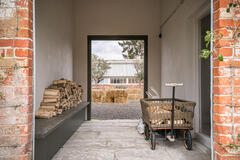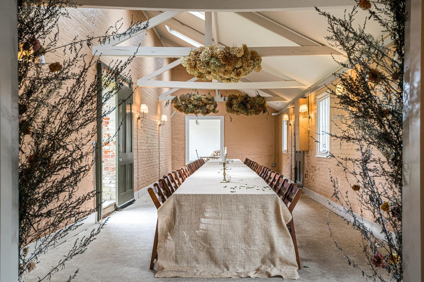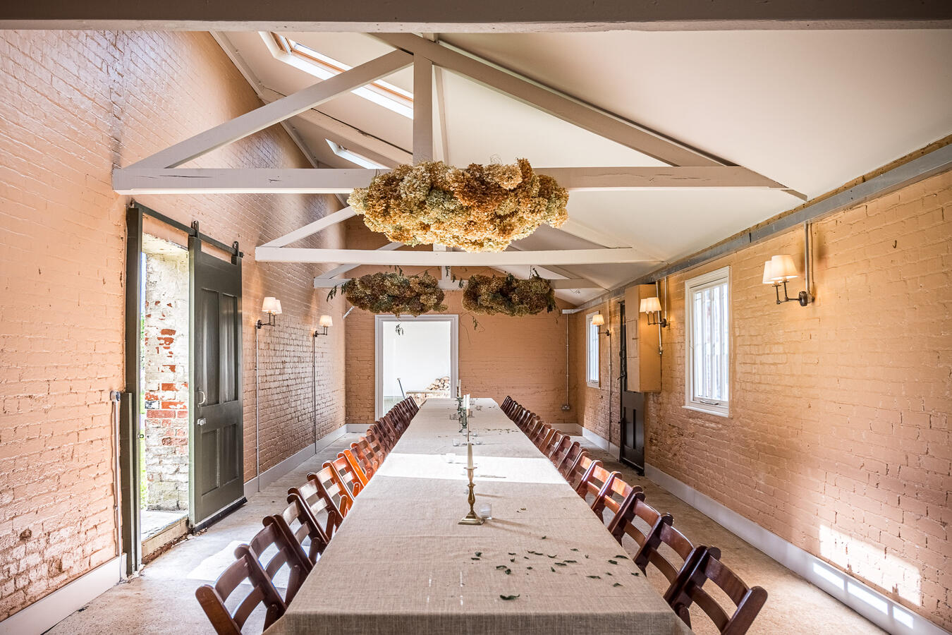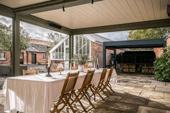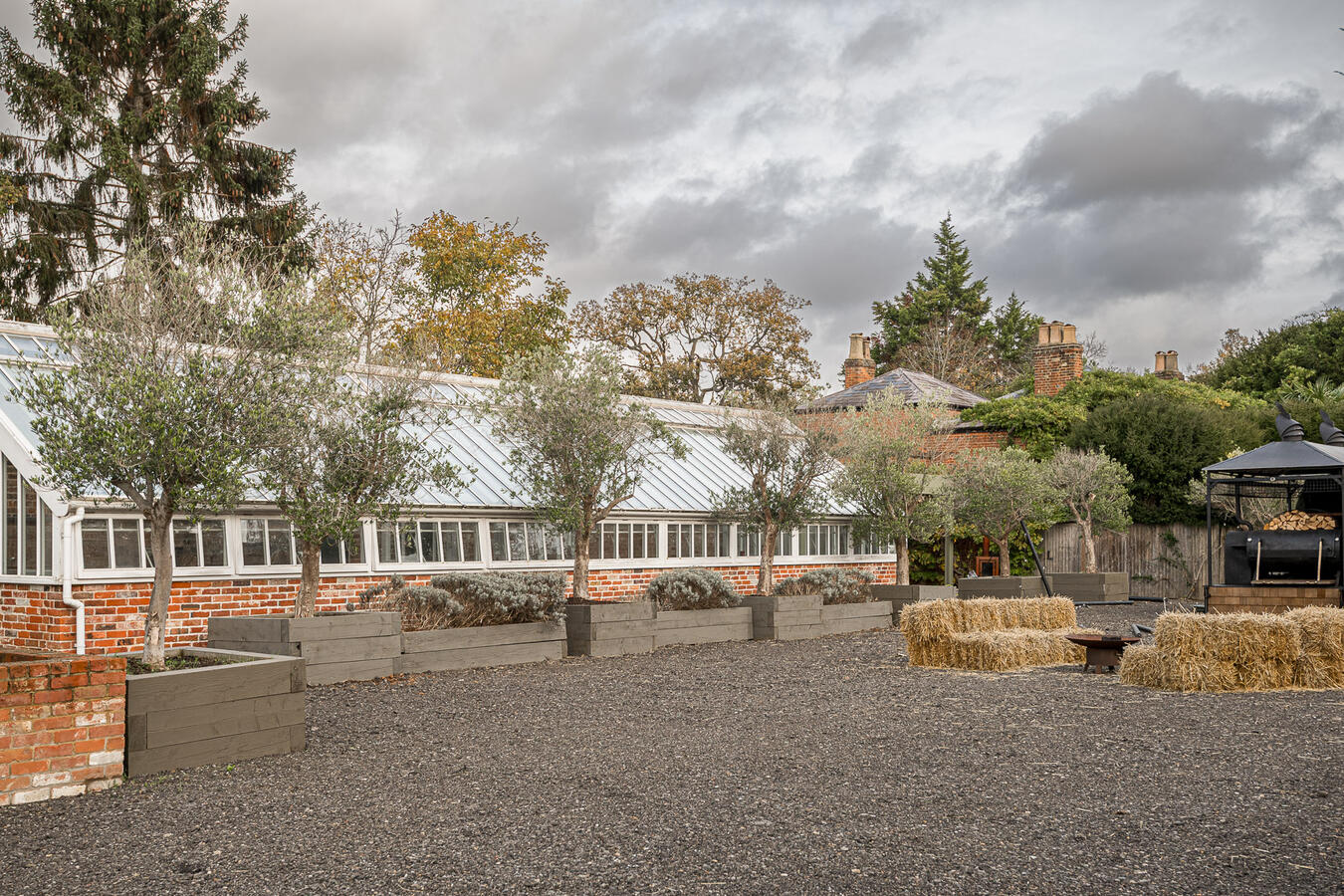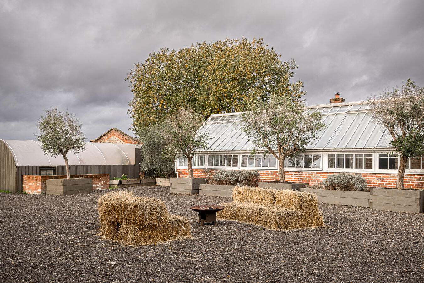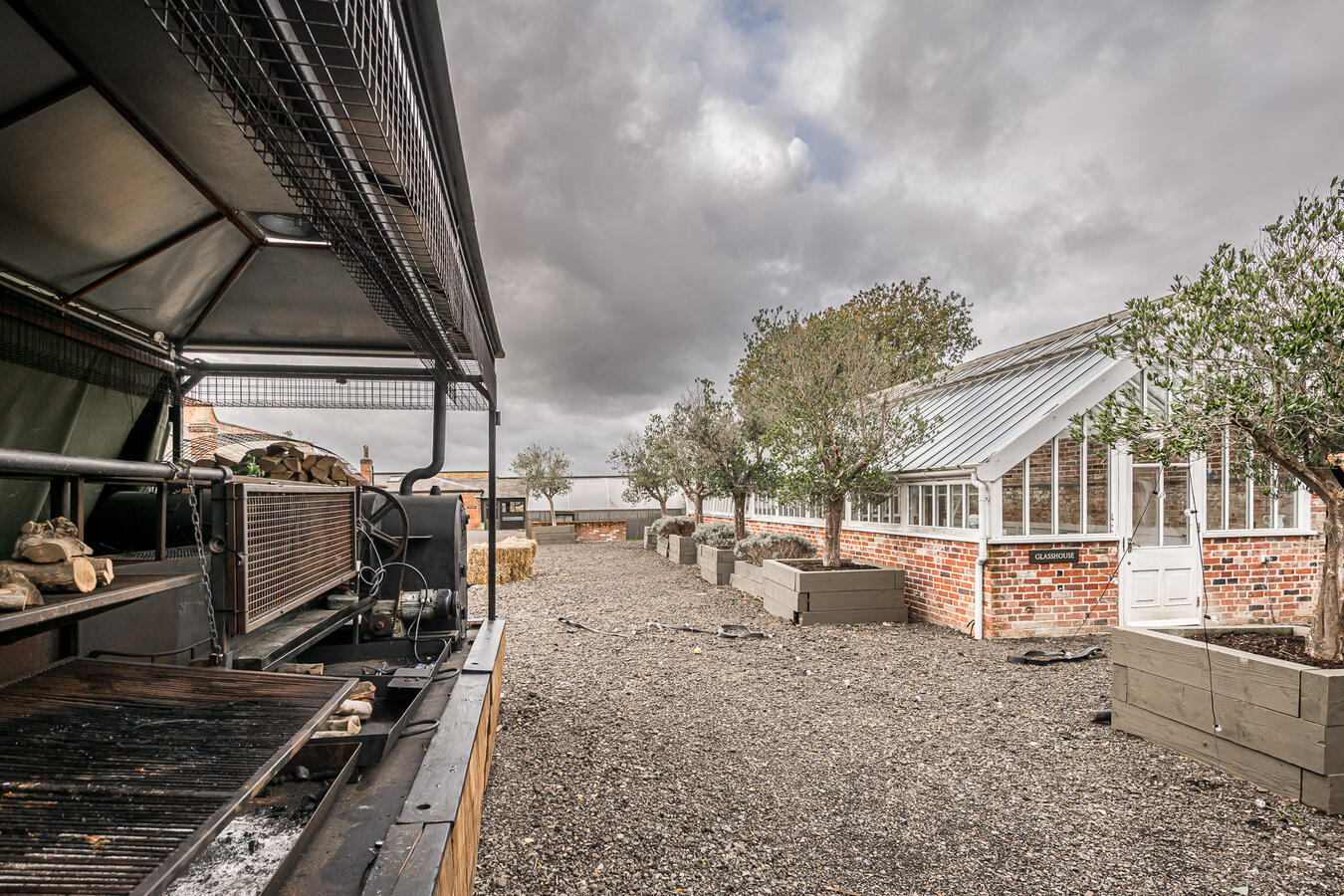 The site features a series of beautifully restored spaces including an original potting room, now transformed into an atmospheric dining hall, and a glasshouse where natural light filters through from morning to dusk. Additional highlights include a covered alfresco dining area with retractable roof and heaters, a striking open-fire cooking space, and two converted stables now used as studio or meeting areas.