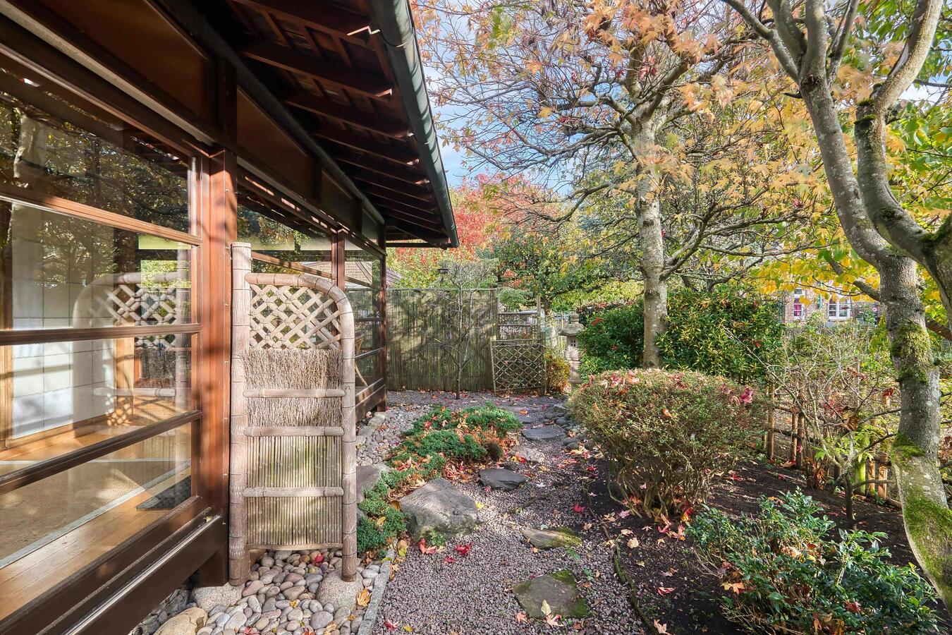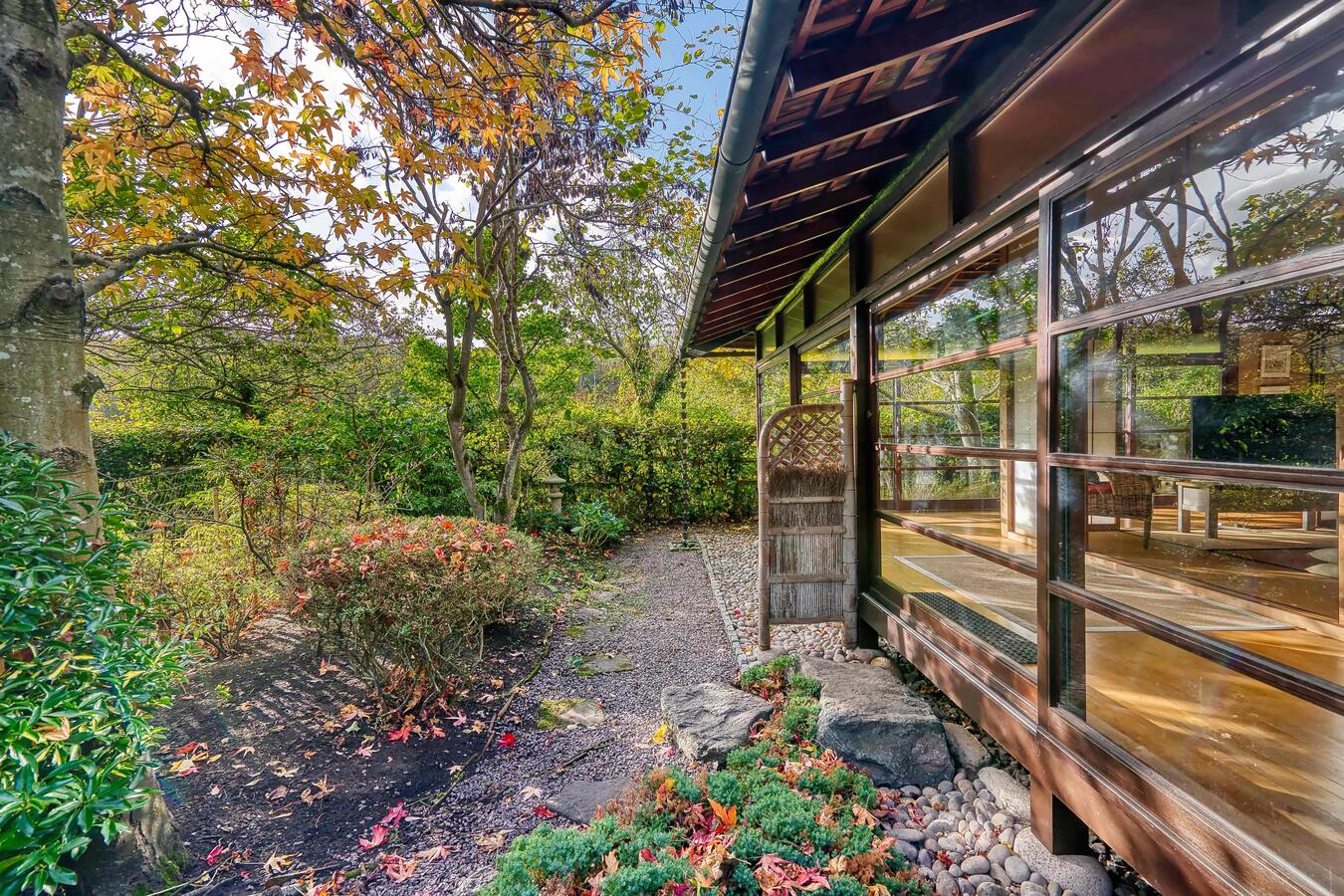 A beautifully atmospheric Japanese Garden Room, architect-designed and traditionally built in timber, set within a private landscaped garden. Measuring approximately 60-80 sqm, this serene standalone structure offers an authentic Japanese aesthetic with shoji screens, tatami-style interiors, natural timber ceilings and wraparound glazing that looks directly onto the surrounding greenery.