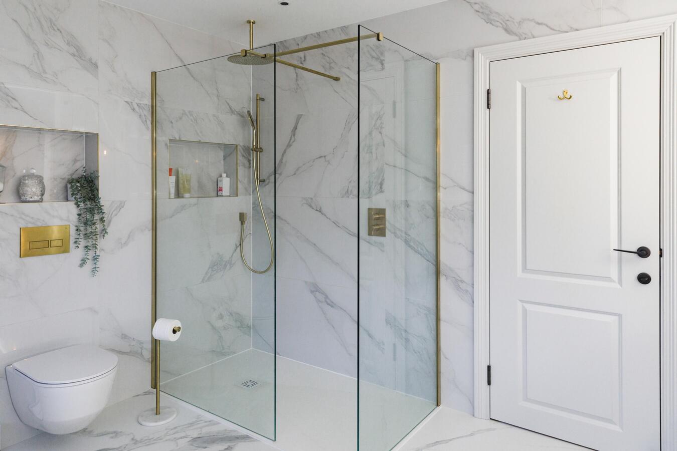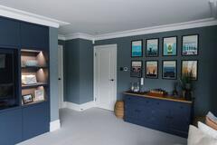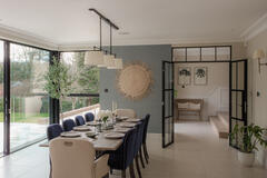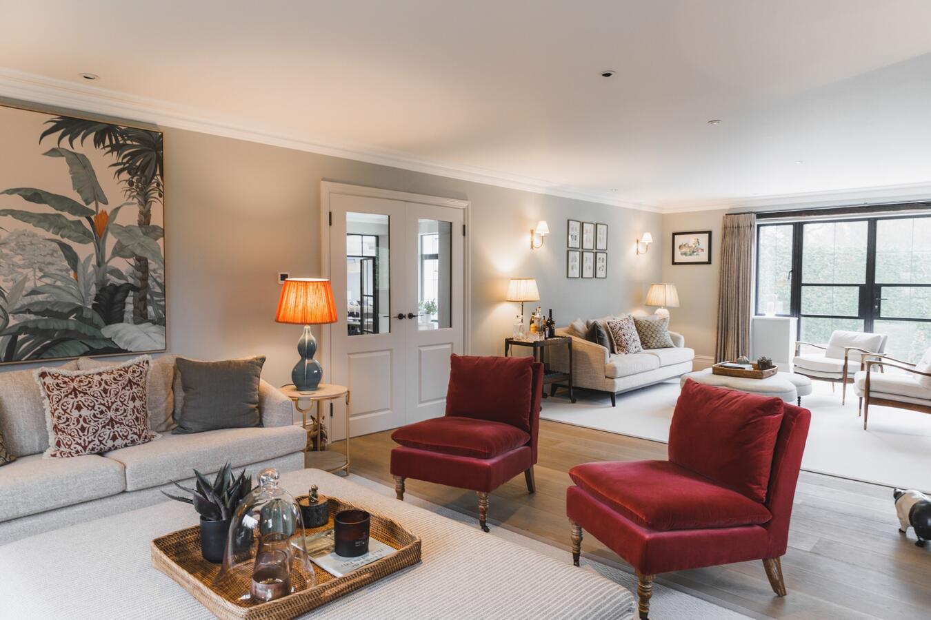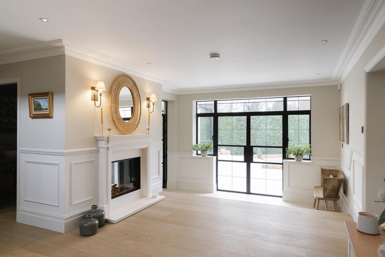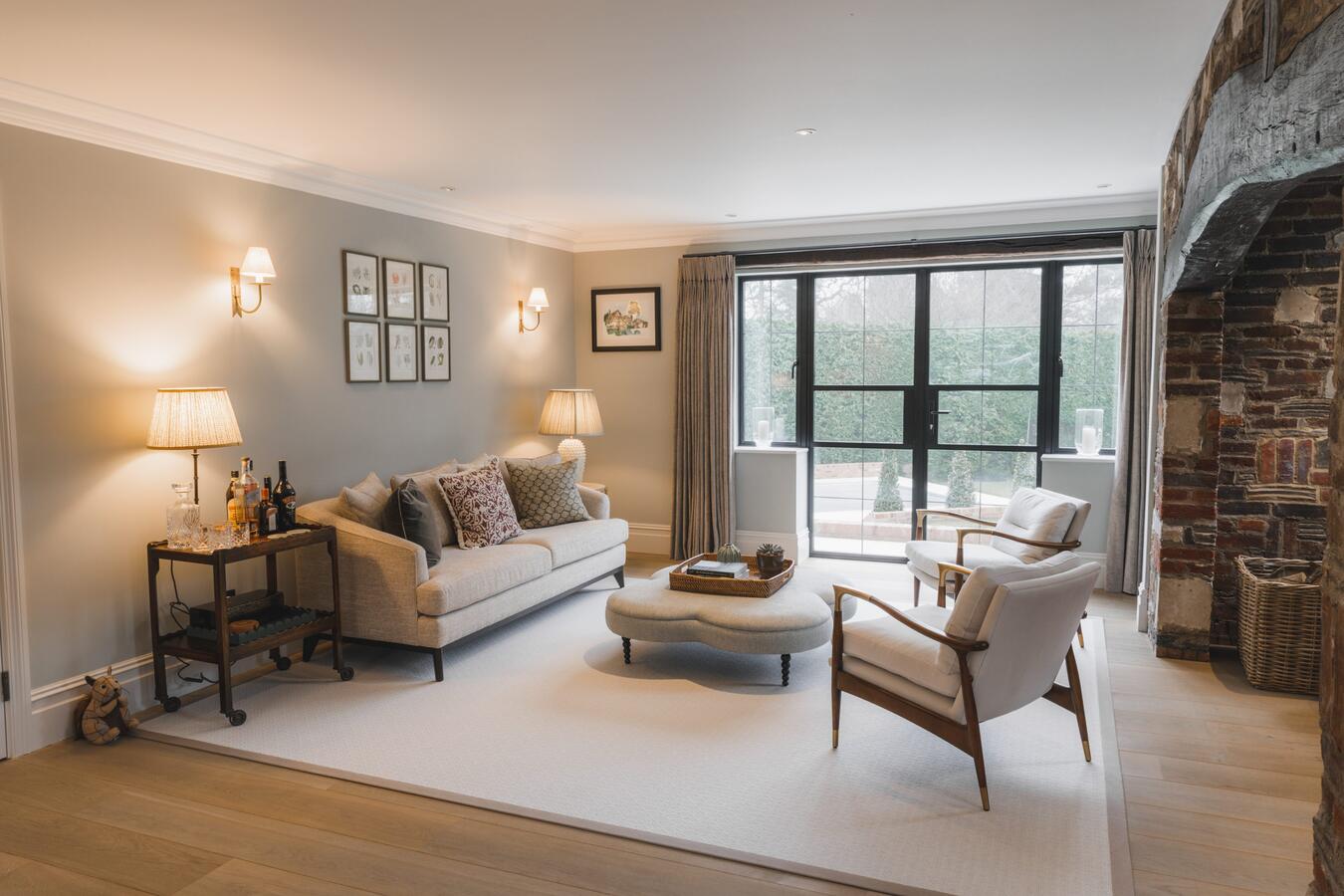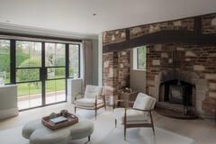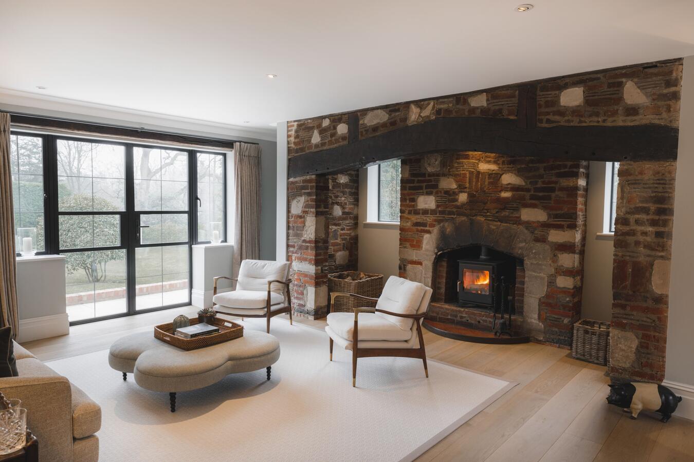 The main open-plan dining space features floor-to-ceiling glazing and large sliding doors opening directly onto the garden and terrace, creating strong indoor-outdoor sightlines and excellent natural light. A formal reception room centres around a striking inglenook fireplace with exposed brick and timber beam, providing a warm, characterful contrast to the cleaner-lined modern spaces elsewhere in the house. Additional living areas include a relaxed snug / TV room and generous circulation spaces, supporting flexible set builds and efficient crew movement.