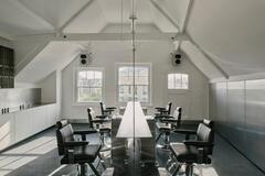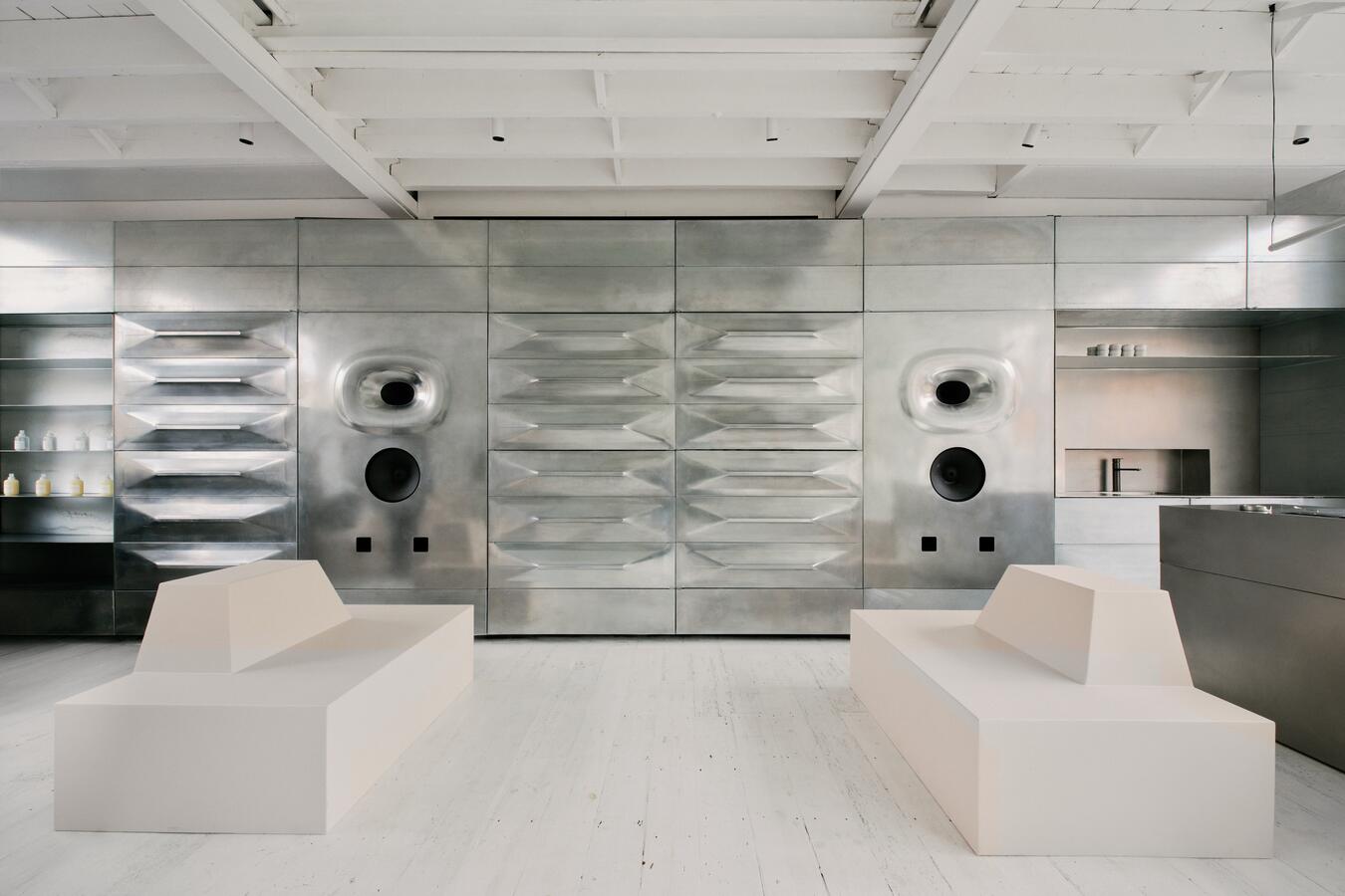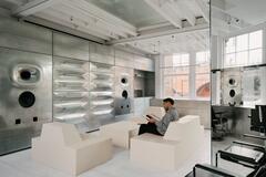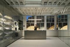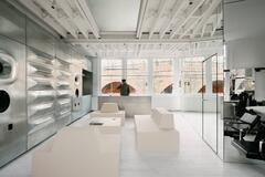 Interiors combine industrial stainless steel walls, sculptural metal detailing and exposed white beams with clean-lined furniture and expansive glazing. Large sash windows frame views over a lively market setting, bringing strong natural light and urban energy into the space.