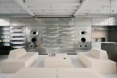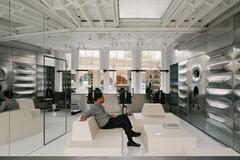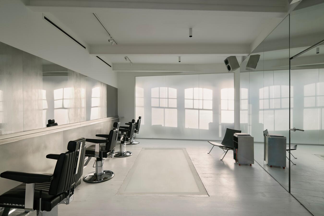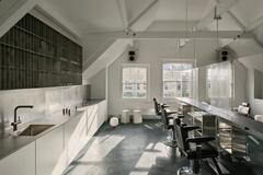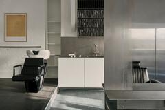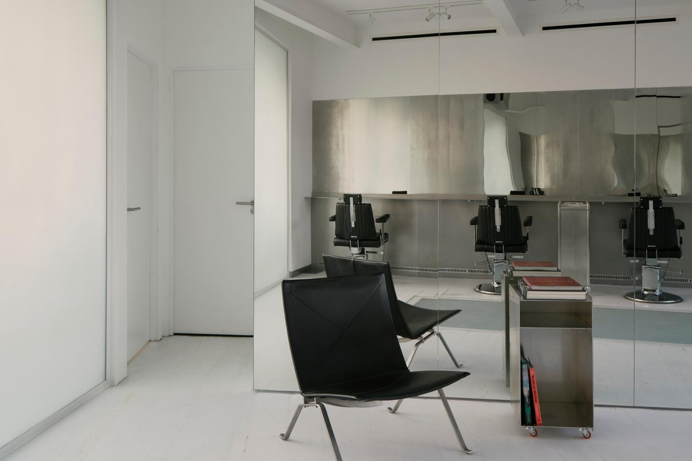 The ground floor features a dramatic reception and waiting area with mirrored walls and geometric seating, creating symmetry and depth ideal for fashion editorials and brand campaigns. Upper floors provide additional cutting and colour stations, minimalist worktops and integrated shelving, offering multiple distinct shoot angles within one cohesive aesthetic.