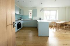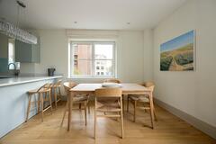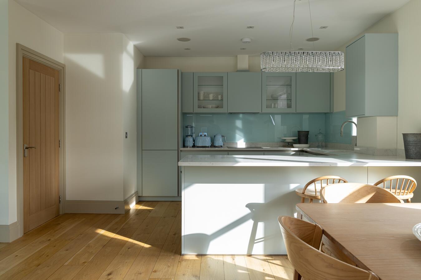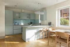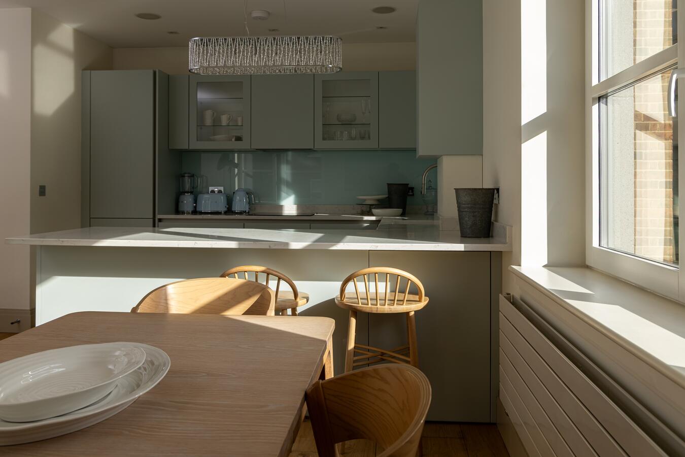 Recently redecorated, the property centres around a spacious open-plan kitchen and living area with high ceilings and a dual-aspect layout. Large windows on two sides allow daylight to flood the space, creating soft, even lighting throughout the day - ideal for filming and photography. The newly fitted kitchen features pale cabinetry, light stone worktops and a glazed splashback, paired with warm timber flooring and Scandinavian-inspired dining furniture.
