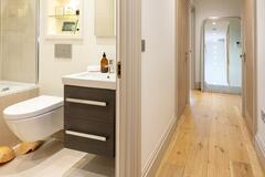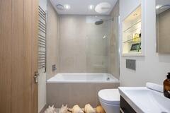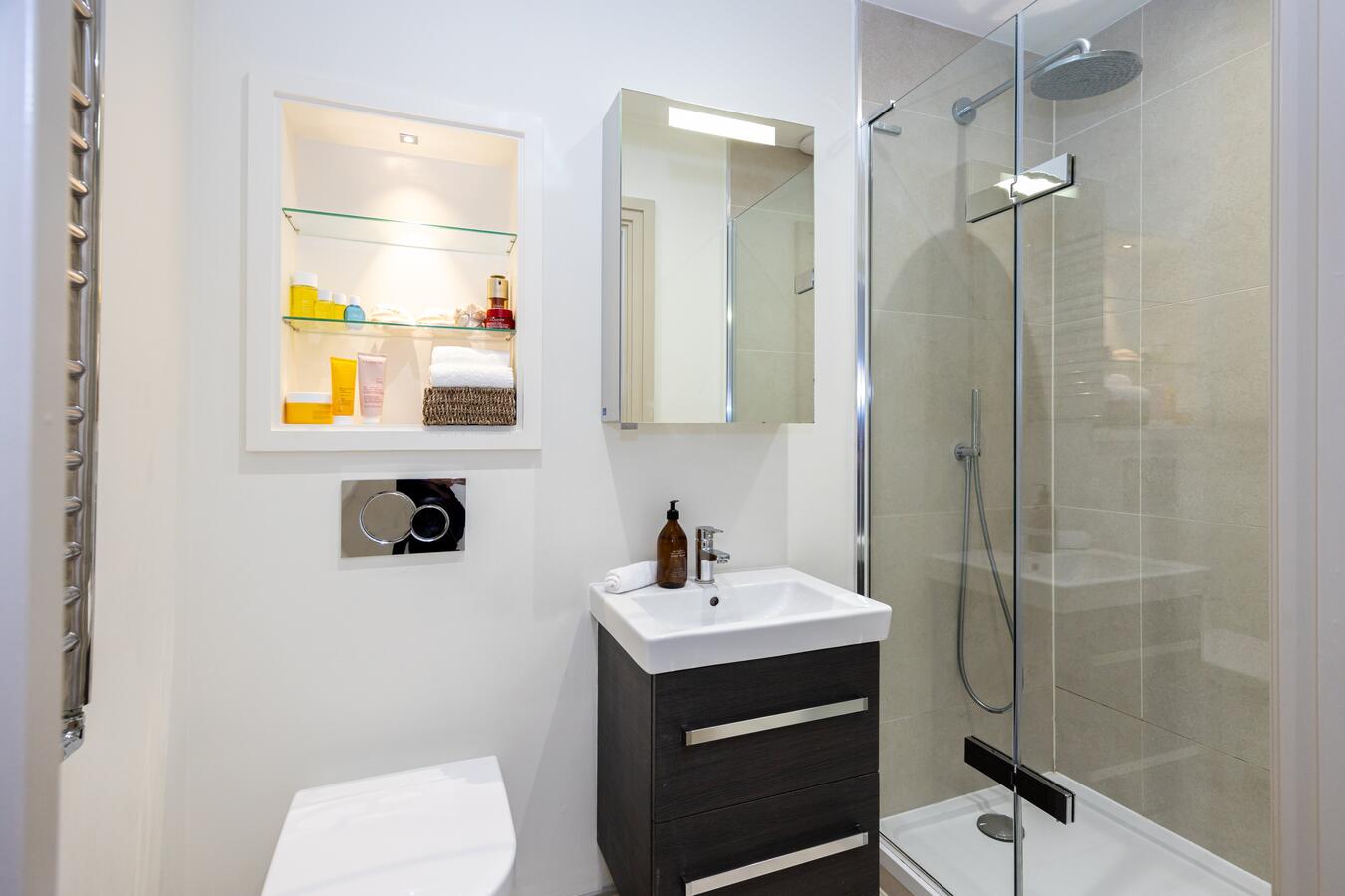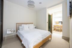 Two well-proportioned bedrooms provide additional shoot options. The principal bedroom is calm and minimal with soft neutral tones, wooden furniture and high ceilings. Bathrooms are modern and streamlined, featuring clean tiling, a bath with overhead shower and contemporary fittings.