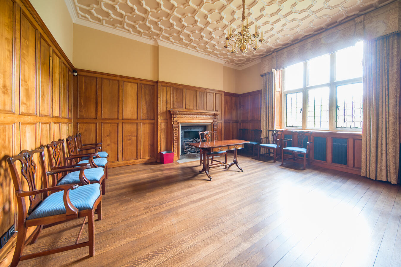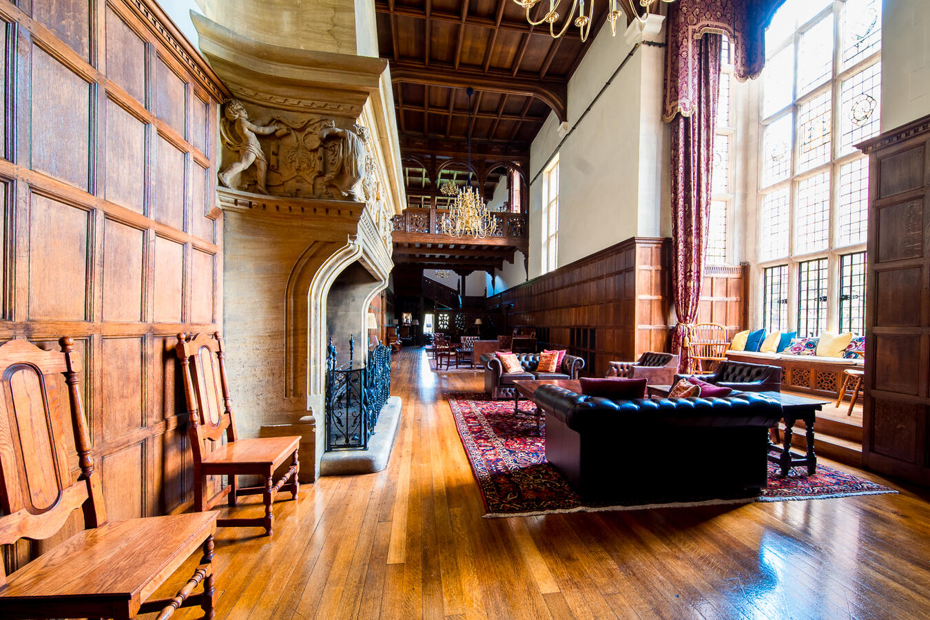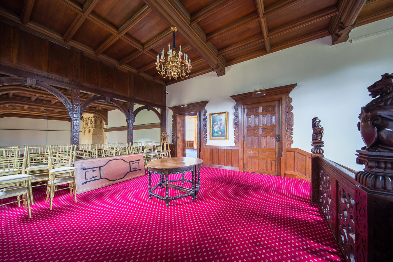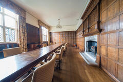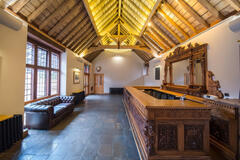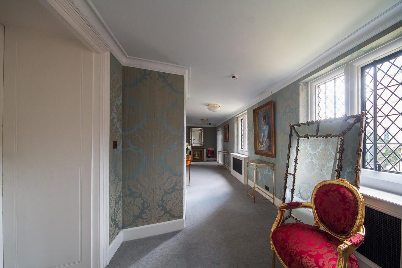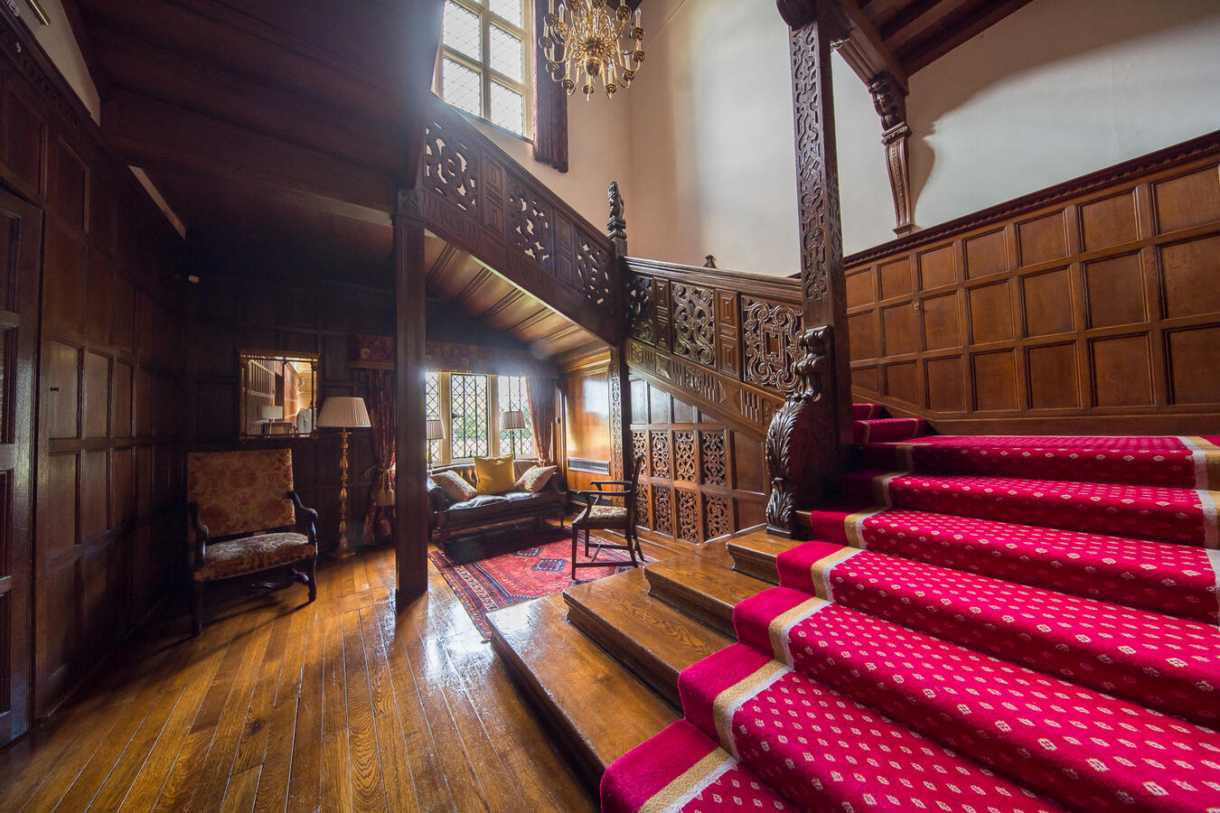 The main house features an extraordinary collection of Jacobean interiors, including the impressive High Gallery with its carved staircase, decorative balcony and dramatic vertical volume. Rich wood panelling, intricate plaster ceilings, heraldic detailing, leaded windows and carved stone fireplaces create an authentic period backdrop throughout.