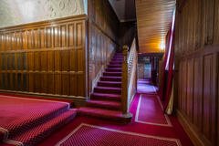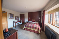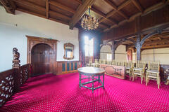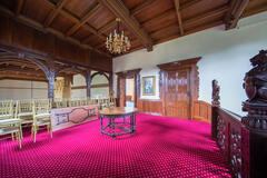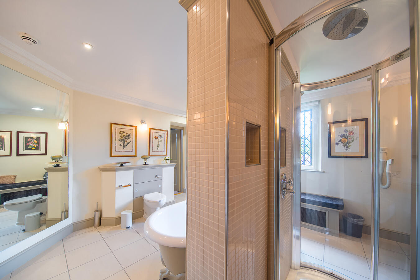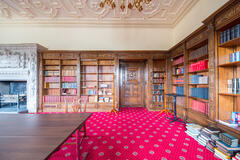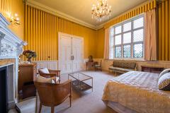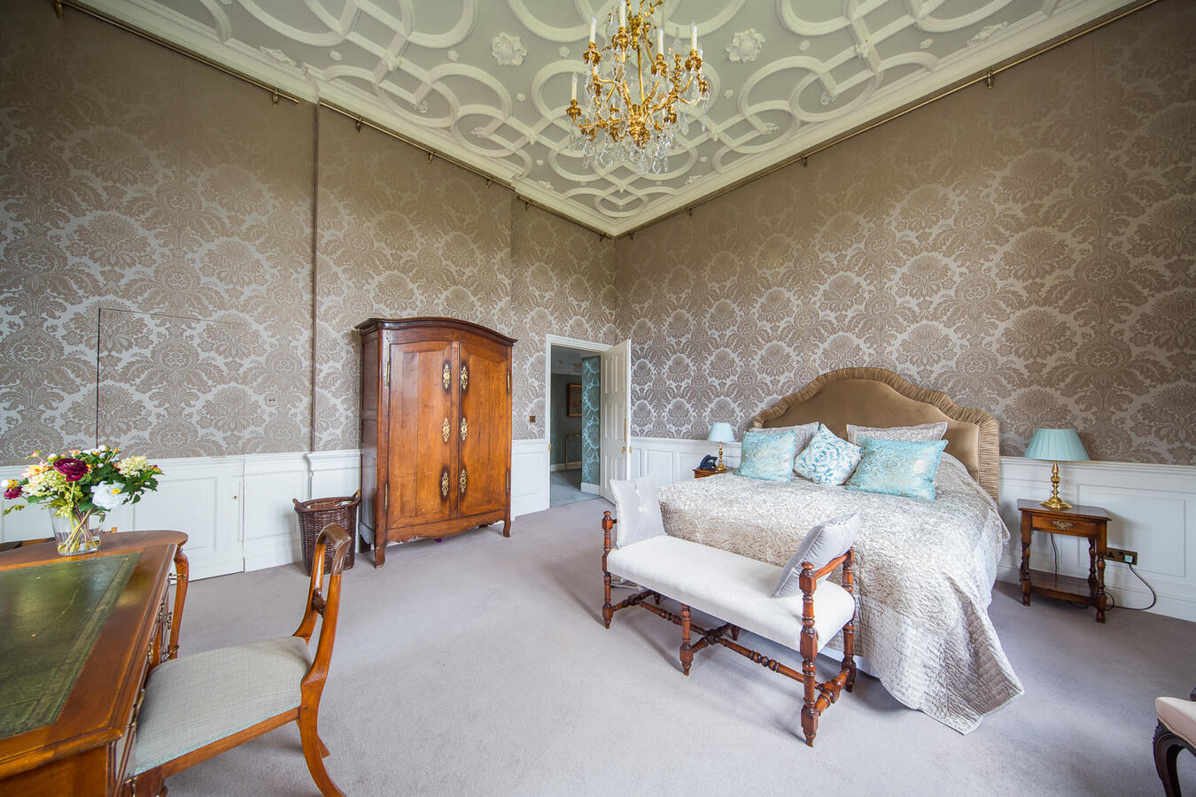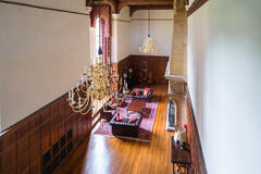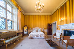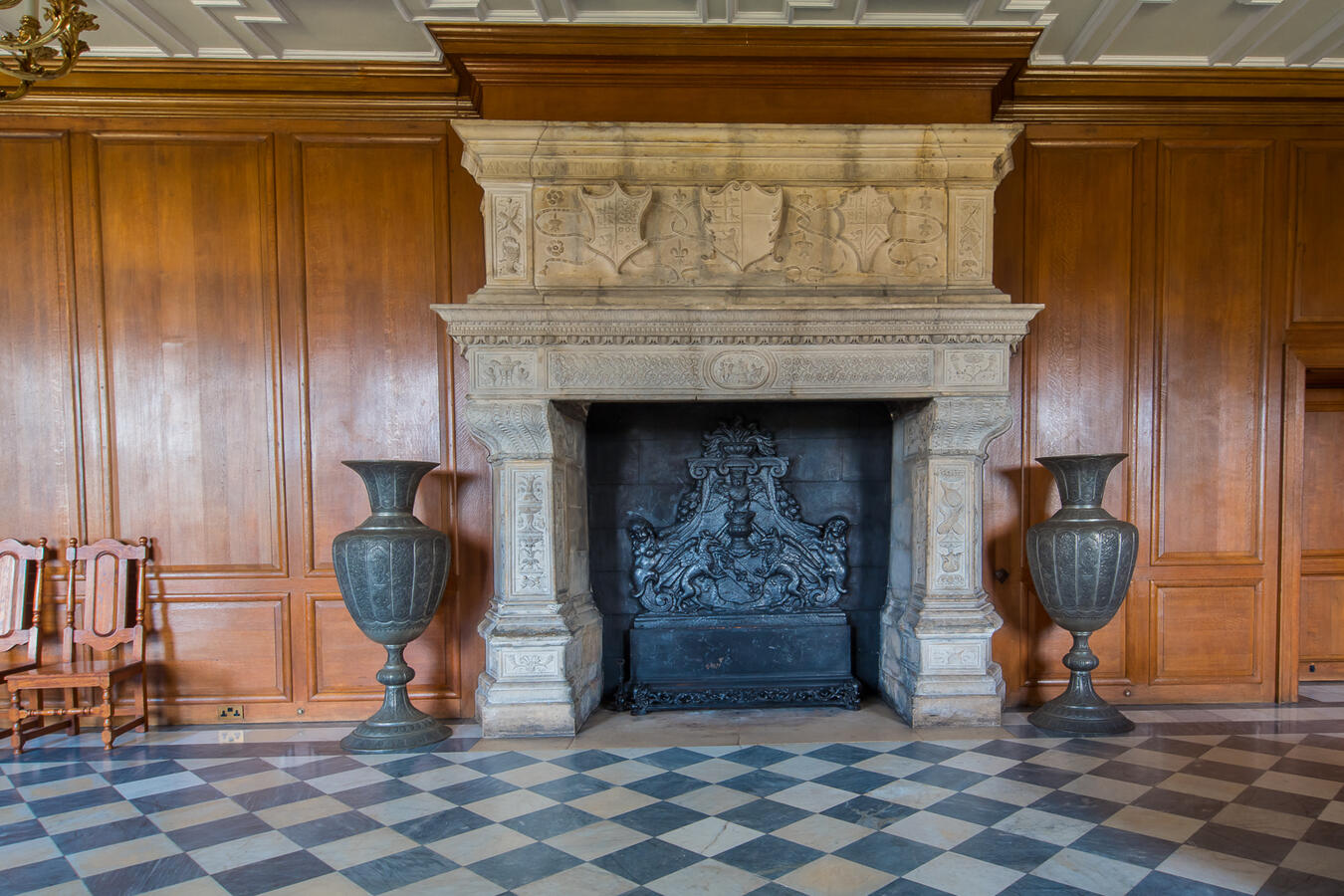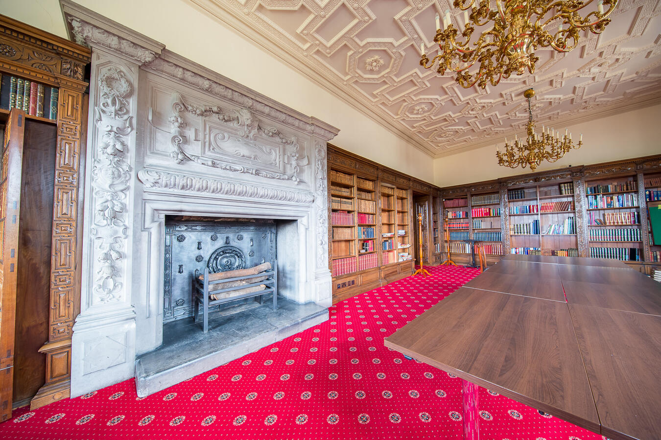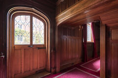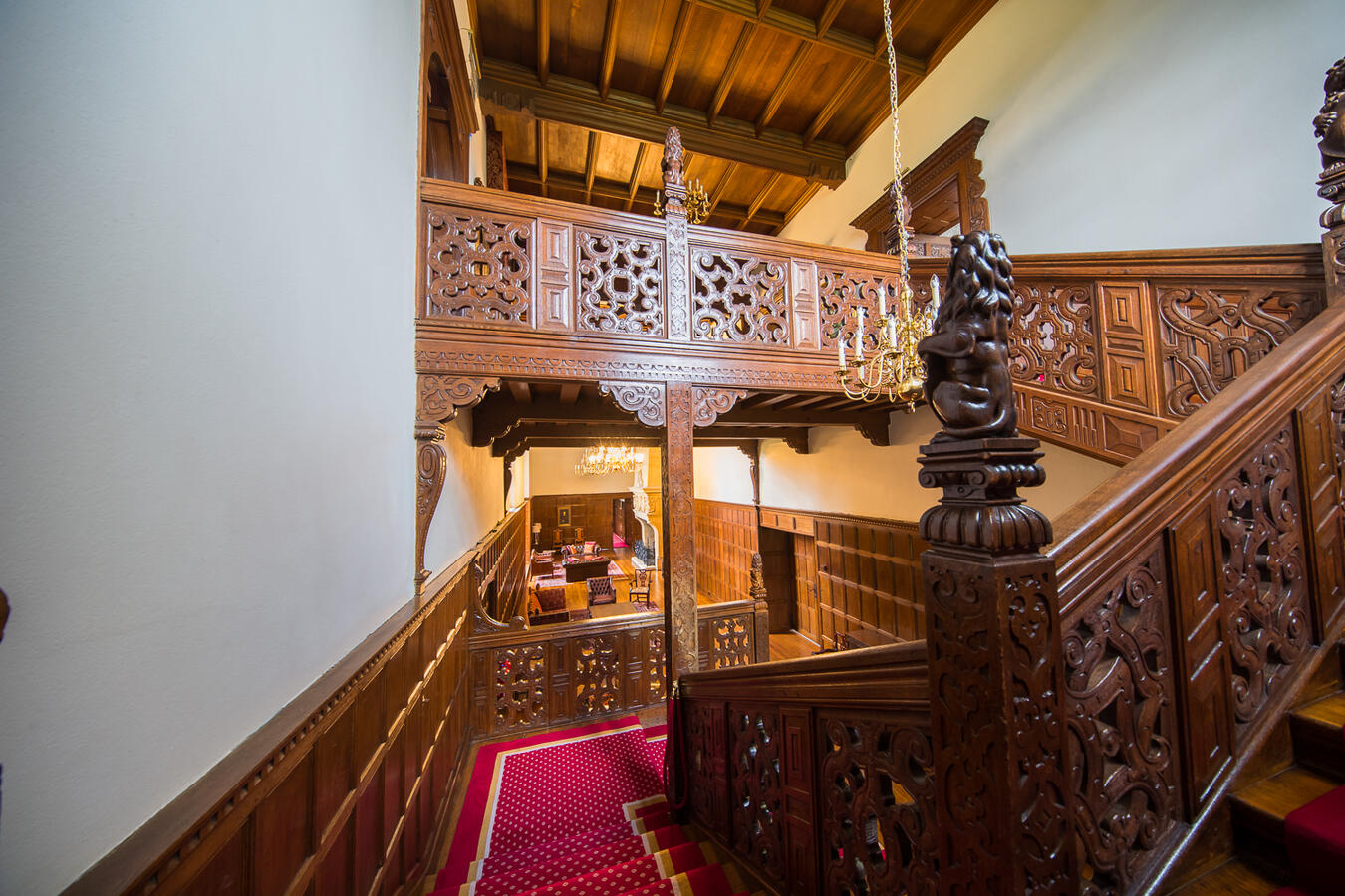 The main house features an extraordinary collection of Jacobean interiors, including the impressive High Gallery with its carved staircase, decorative balcony and dramatic vertical volume. Rich wood panelling, intricate plaster ceilings, heraldic detailing, leaded windows and carved stone fireplaces create an authentic period backdrop throughout.