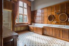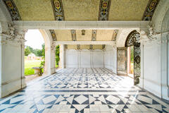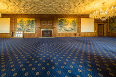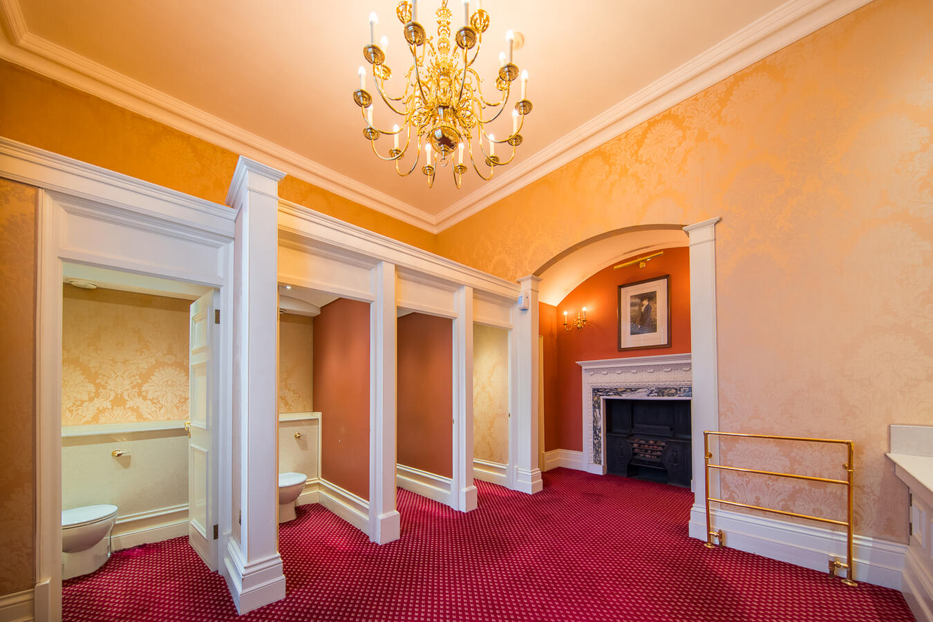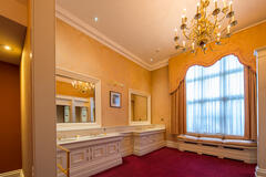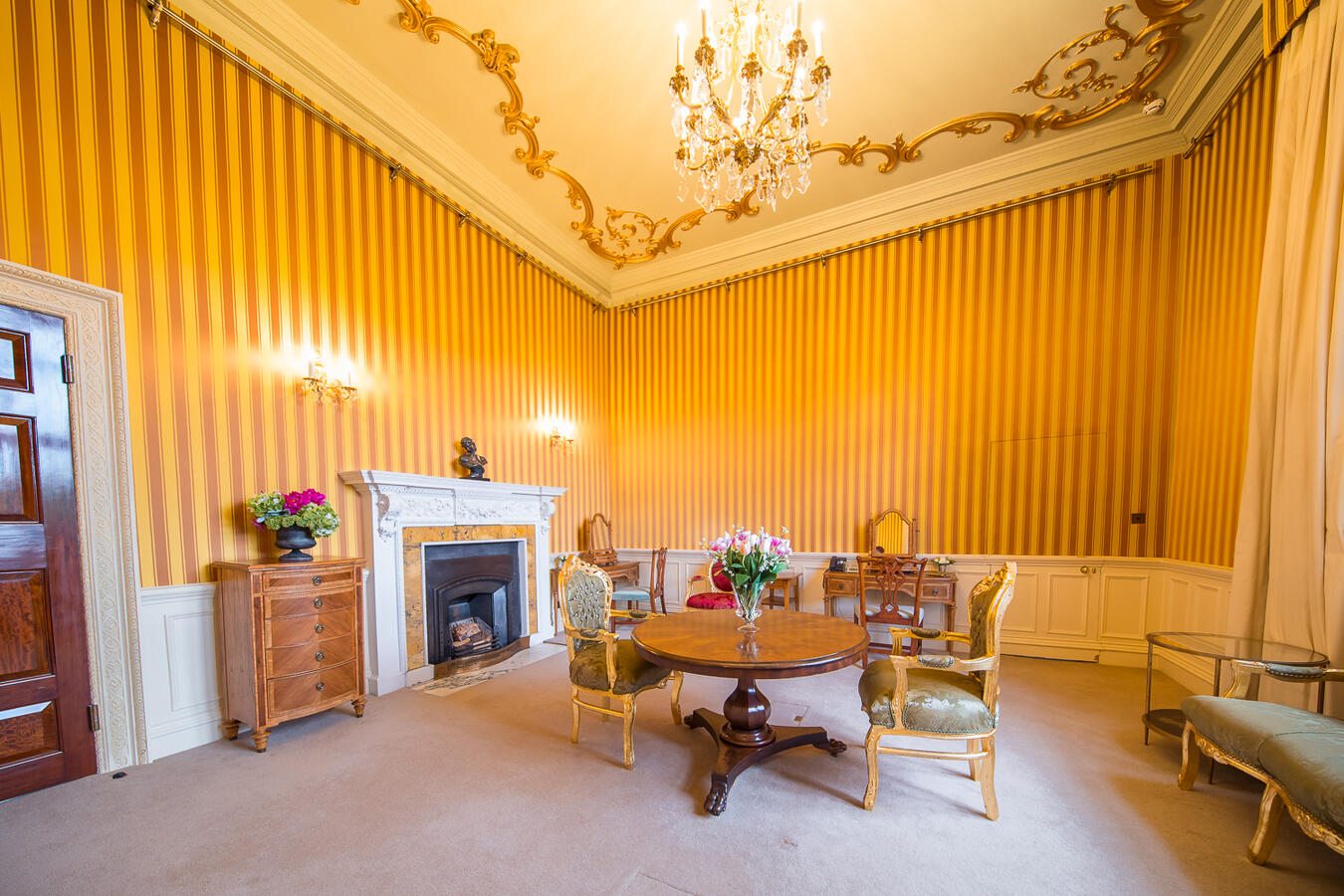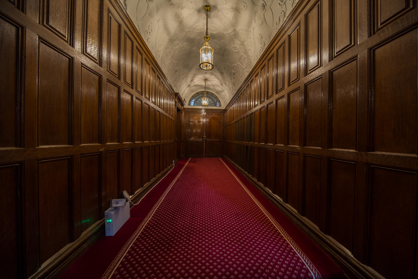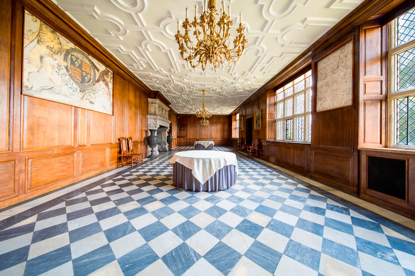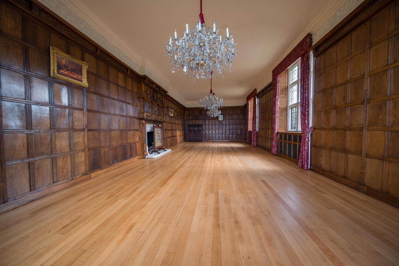 Several grand state rooms provide scale and flexibility. The long wood-panelled gallery with chequerboard flooring and chandeliers delivers strong symmetry and depth for tracking shots, while the vast reception hall with ornate plaster ceiling and crystal chandeliers offers a true "stately home" aesthetic. Large windows bring excellent natural light across multiple elevations.