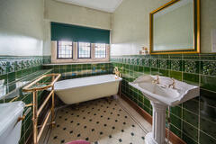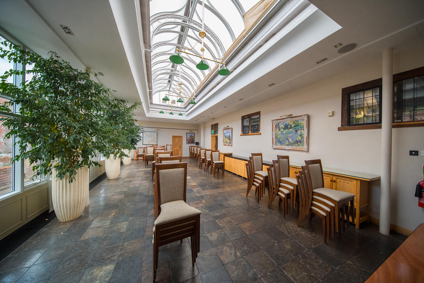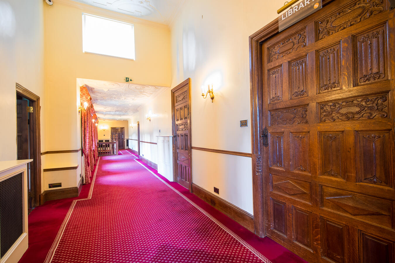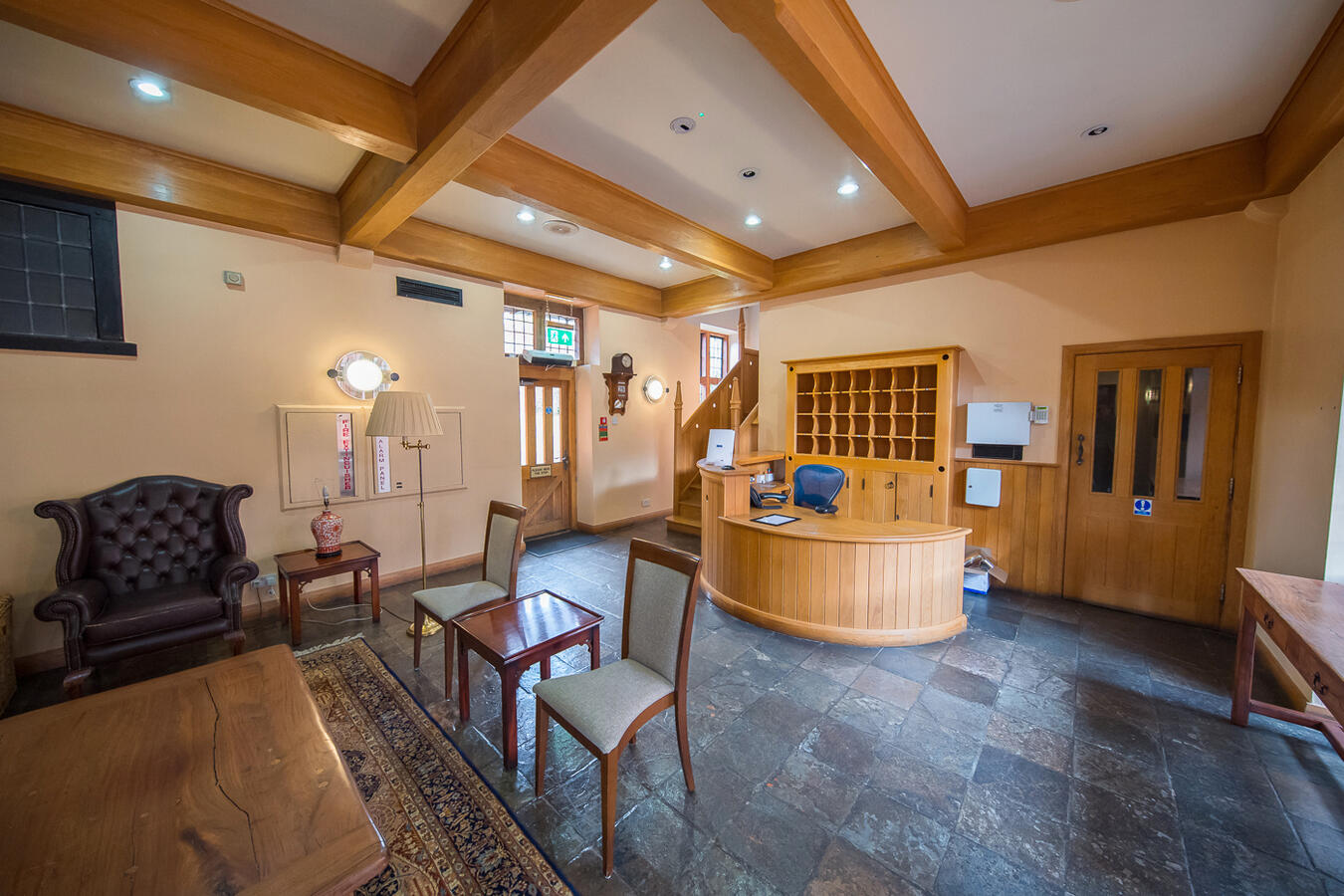 Beyond the principal rooms, the estate includes a range of additional filming assets. A vaulted timber-beamed bar space with stone flooring offers a contrasting, more rustic setting ideal for hospitality scenes, private members' club styling or contemporary use. Reception areas, guest bedrooms and secondary corridors provide practical, story-supporting environments.