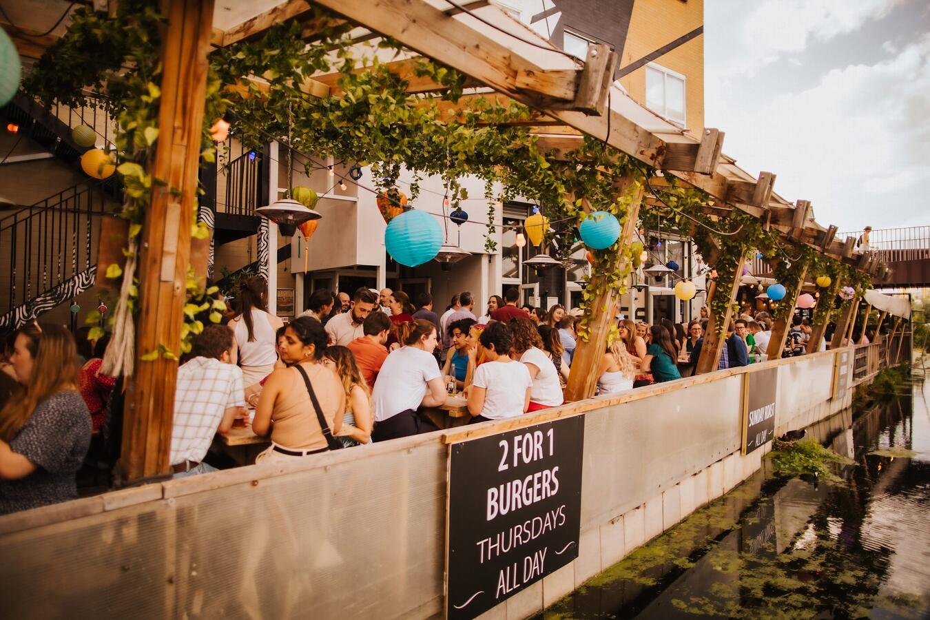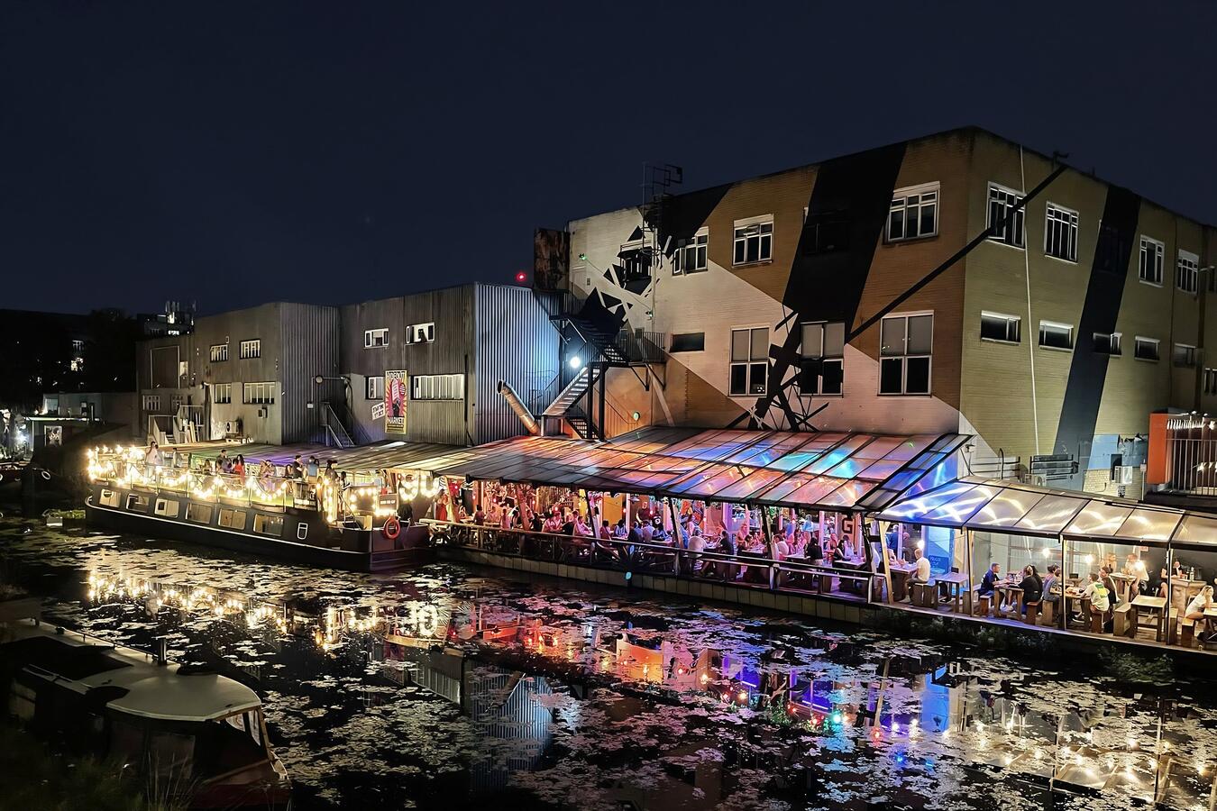 A canal-side bar and restaurant in Hackney, East London, featuring a covered terrace and private boat access. The venue spans 2,000 sq ft and can accommodate up to 550 standing guests or 130 seated.