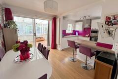 To the rear, the property opens into an open plan kitchen and dining space which creates a functional family environment. This leads through to a full width conservatory spanning the back of the house, offering additional filming space and views out onto the garden.